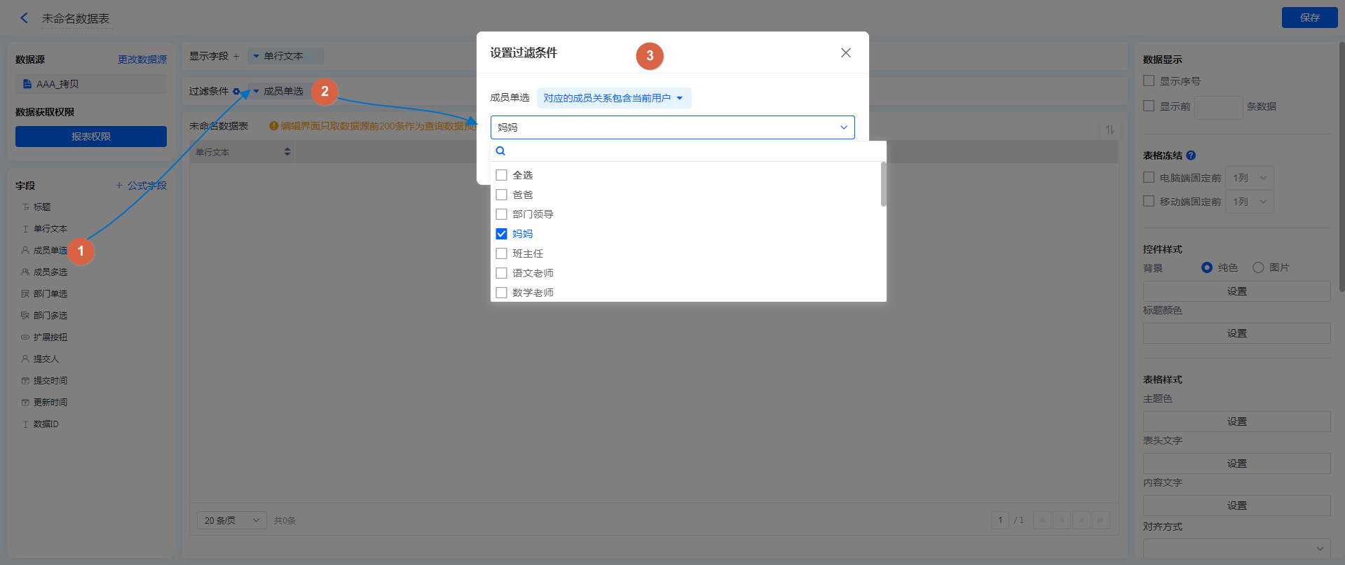 成员控件筛选方式 筛选出成员字段中,成员的妈妈为当前用户的数据;