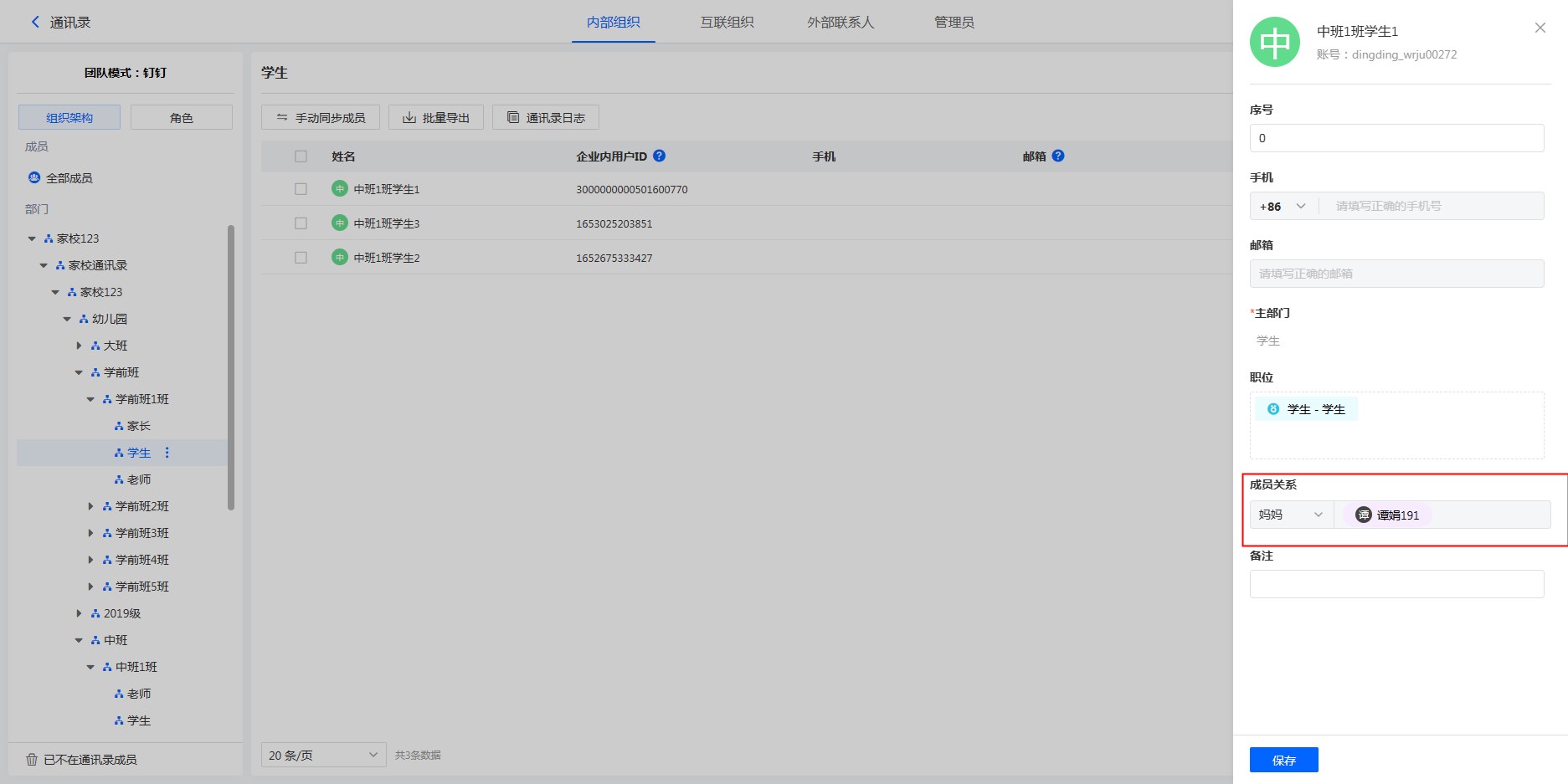 • 钉钉家校团队、企业微信家校团队,会同步成员关系到系统通讯录中。