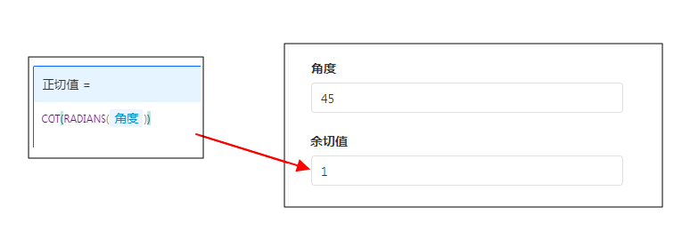 如计算 COT(45°) 的值,可设置公式为COT(RADIANS(45)),返回 1。