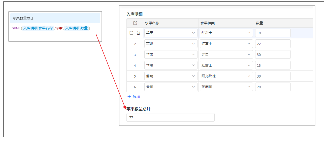如,计算入库明细中水果名称为「苹果」的全部入库数量,则可以在「苹果数量总计」字段设置公式为: