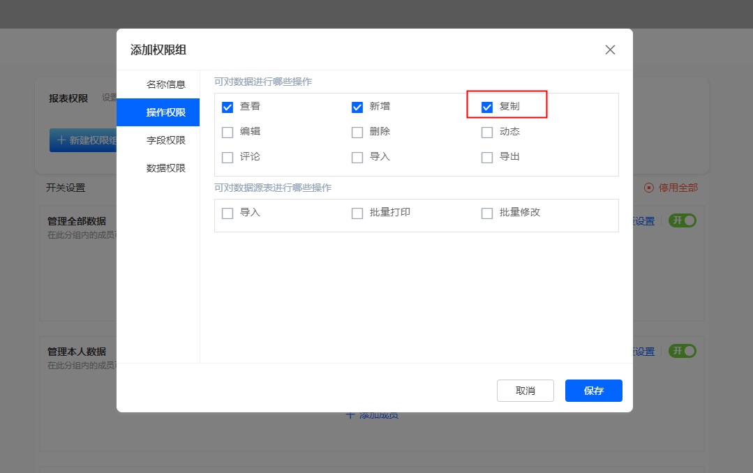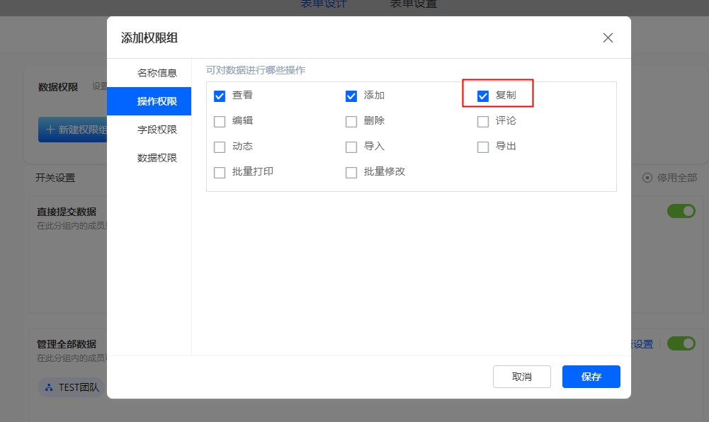 表单设计->数据权限->新建/编辑权限组->勾选[ 复制 ] 权限。