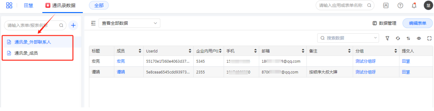 在企业管理中,开启通讯录同步到表单开关,表单默认分组会自动生成通讯录数据应用,里面包含通讯录_成员、通讯录_外部联系人,点击右旁的同步按钮则会把通讯录数据同步至表单通讯录。