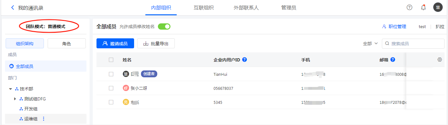 • 对企业进行代管通讯录,组织架构或者成员信息变更时,会同步到表单通讯录中。