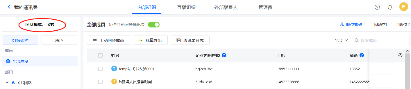 • 飞书团队在飞书管理后台操作组织架构及成员信息时,人员同步至通讯录再同步到表单通讯录中。