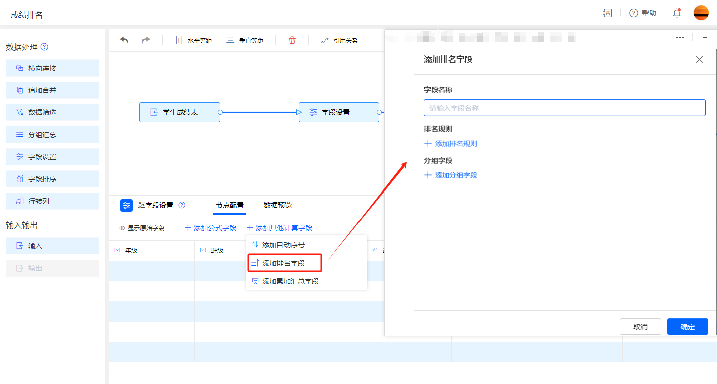点击字段设置的「添加其他计算字段->添加排名字段」,可以添加一个排名字段,排名字段支持以下设置: