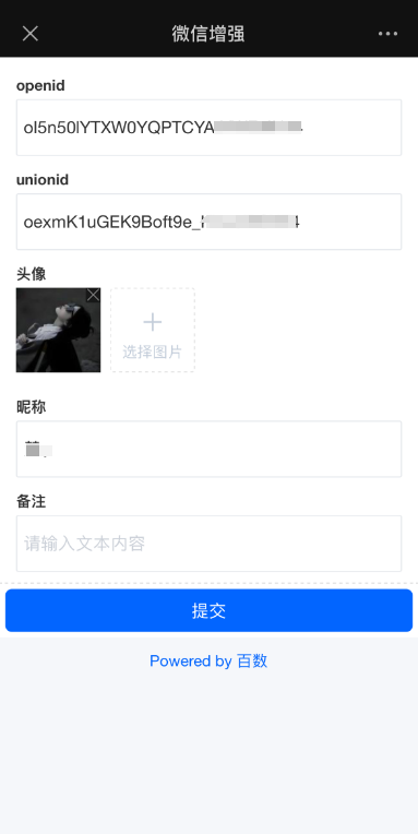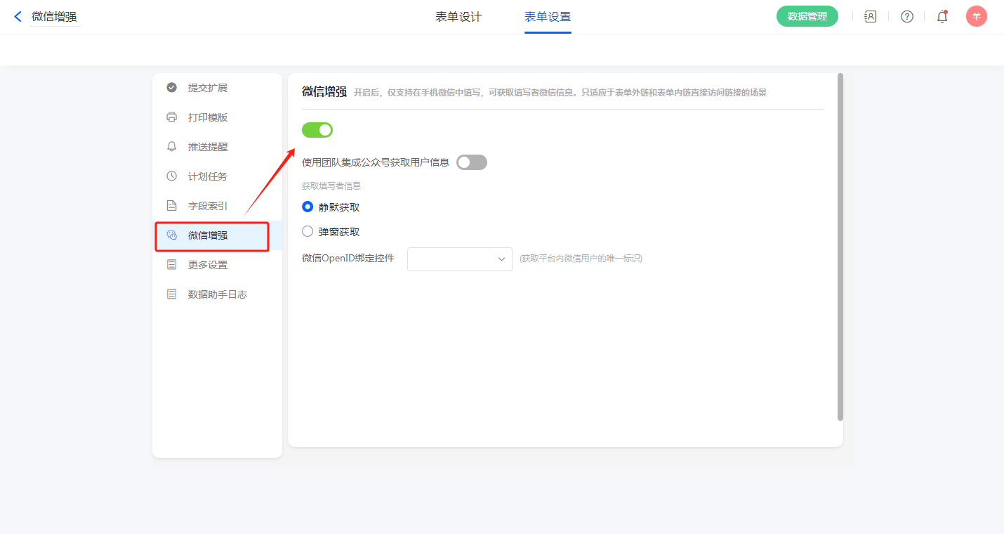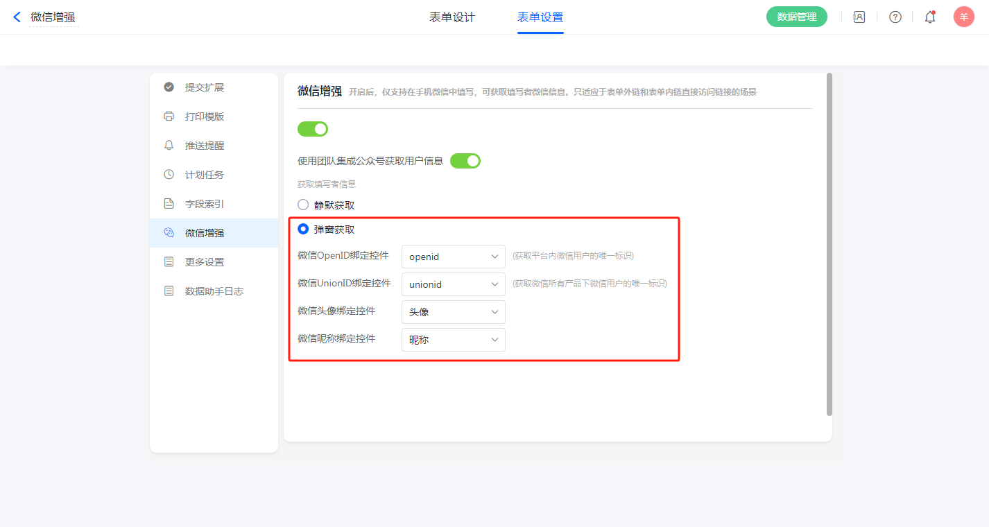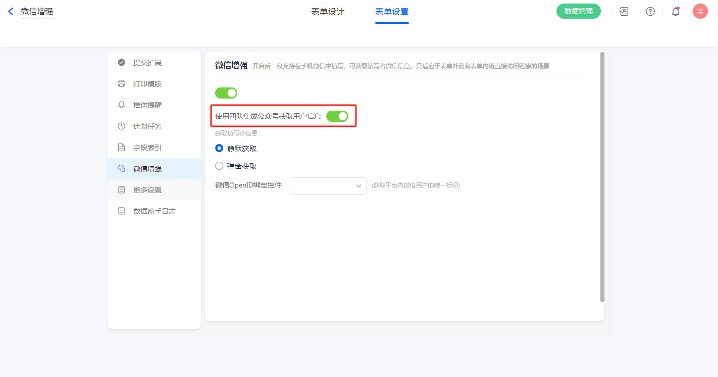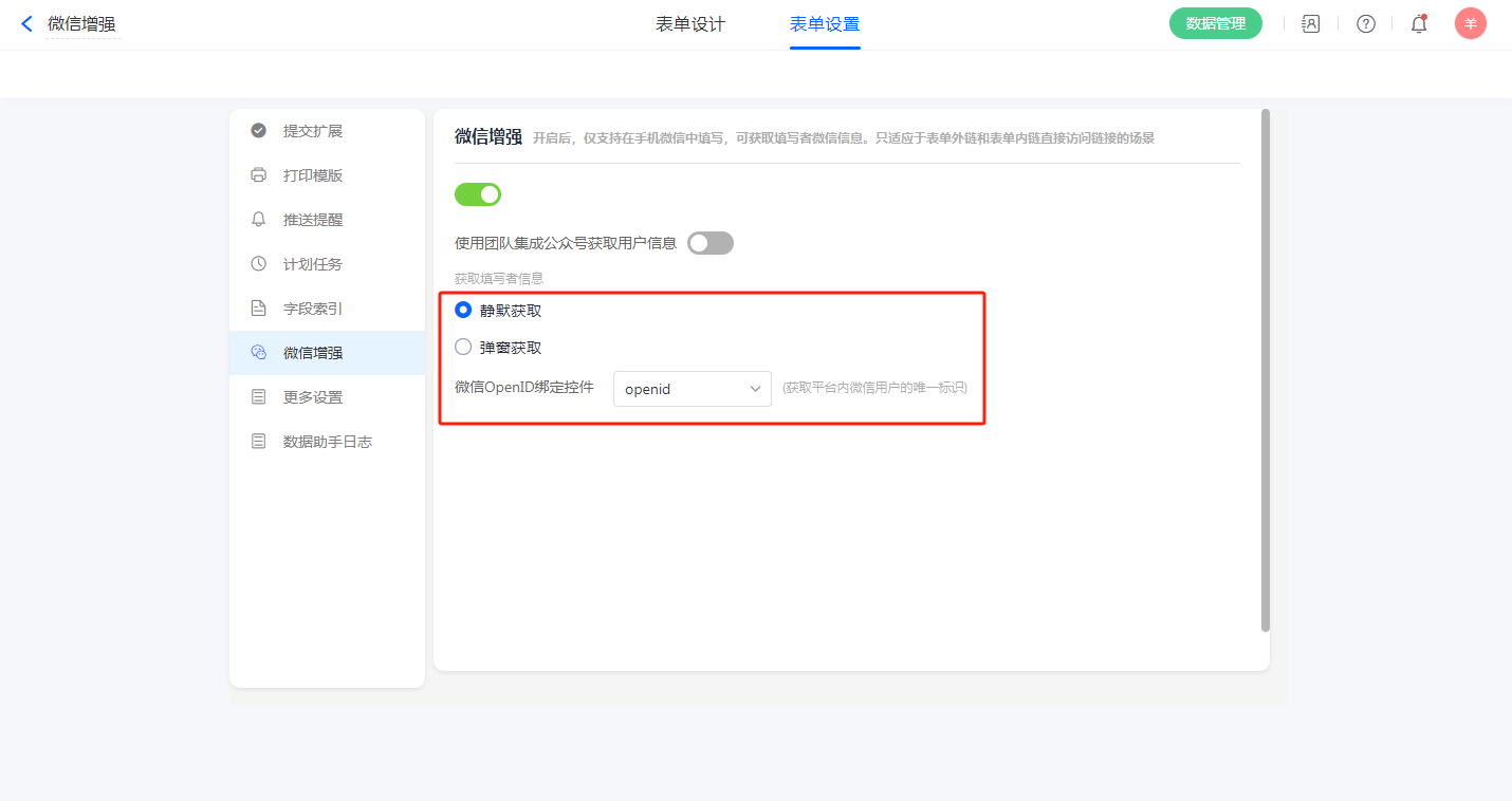 微信增强支持2种方式获取填写者信息分别为静默授权和弹窗获取。