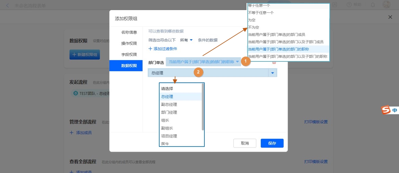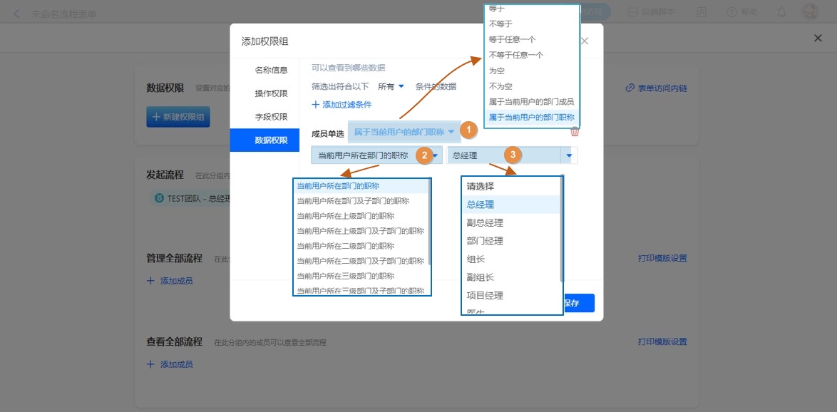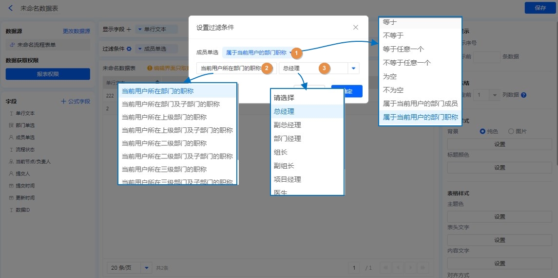 成员控件和部门控件做条件,均支持添加职位过滤,设置方式如下。
