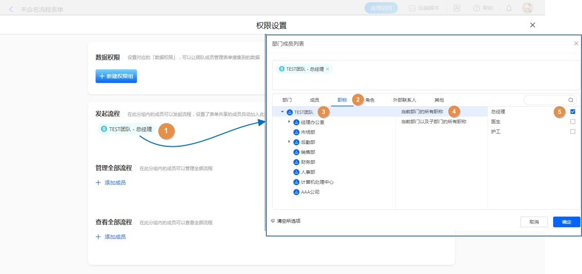 系统的流程负责人、表单/报表权限体系、消息体系、成员控件、报表过滤条件等均支持职位,下面将具体介绍这些场景中职位的使用。