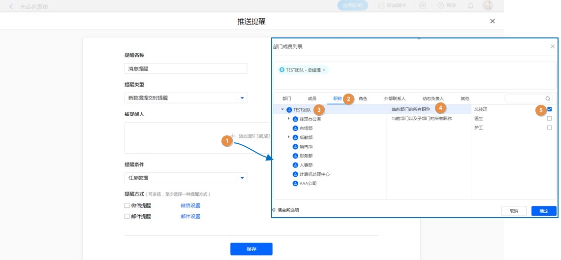 表单消息提醒人或者数据助手消息提醒人设置时,可直接设置职位,满足条件的成员可收到消息。