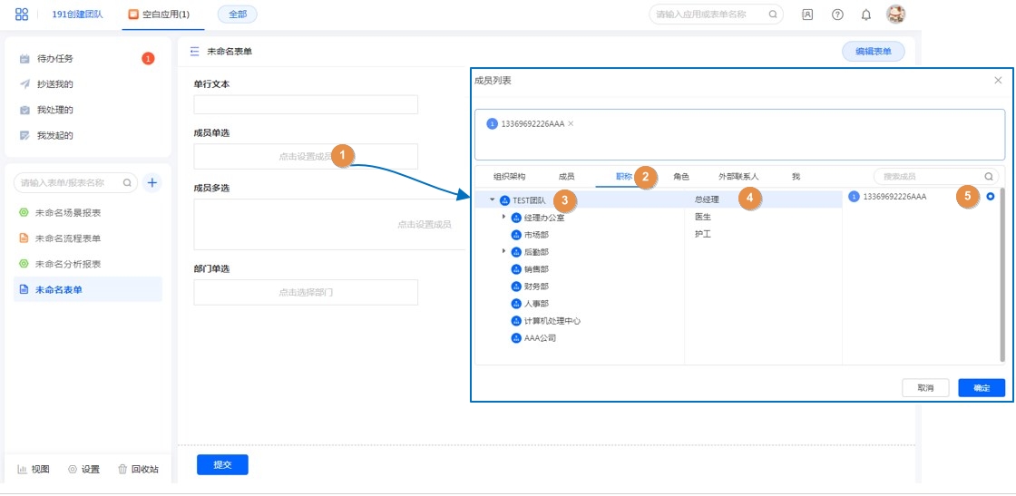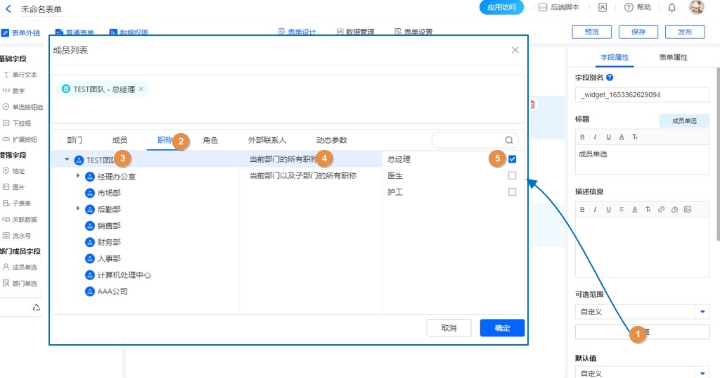 成员控件的可选范围设置、默认值设置以及实际使用选择成员时,都支持职位。