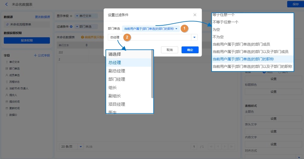 报表的过滤条件,支持设置职位来过滤数据。 成员控件和部门控件做条件,均支持添加职位过滤,设置方式如下。