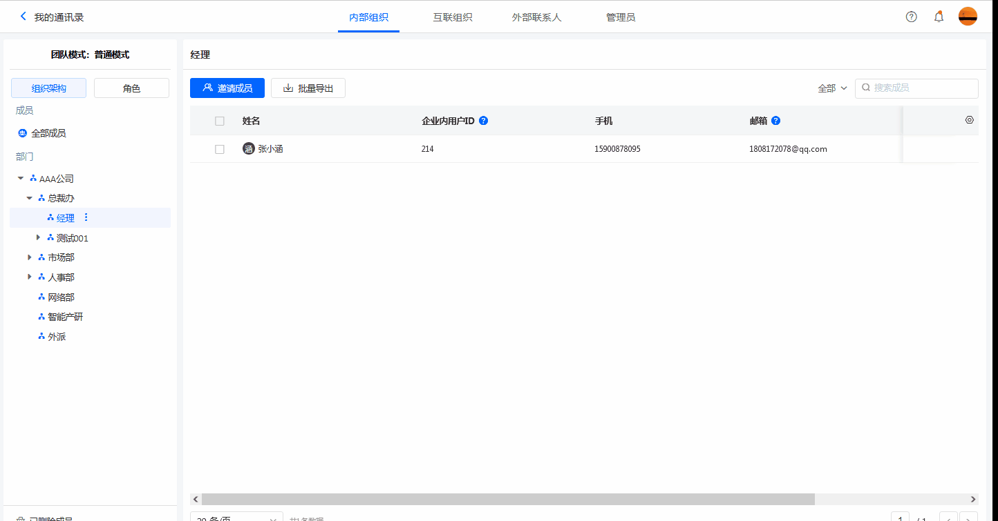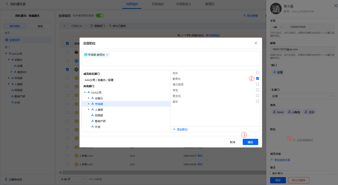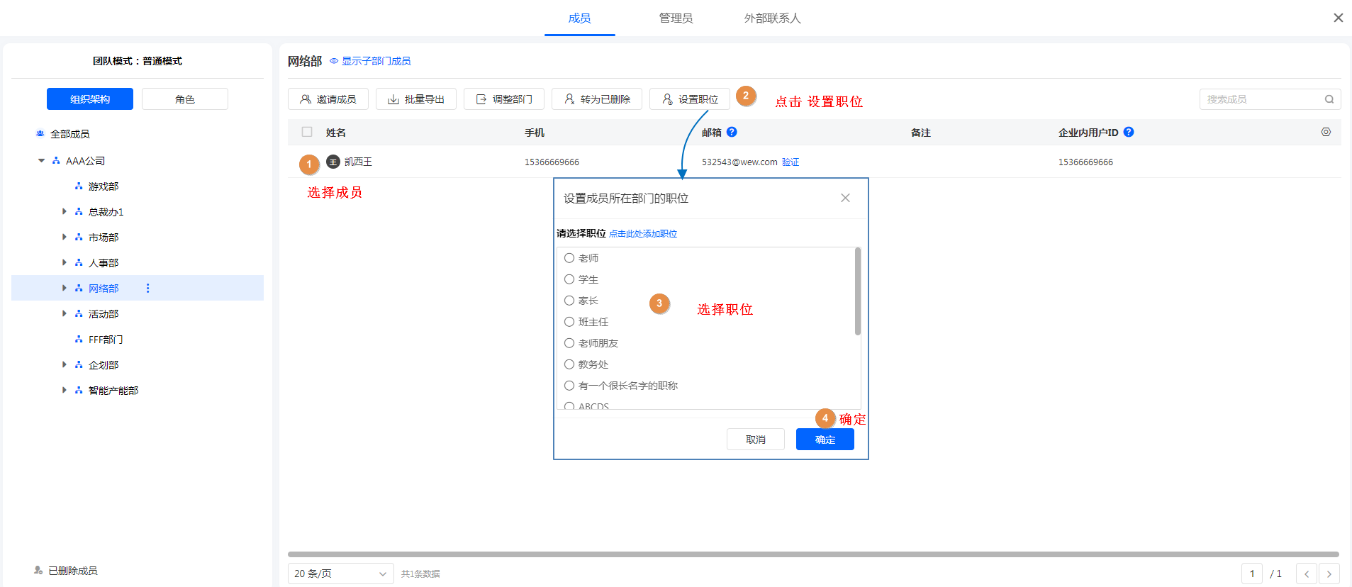 • 方式三:选择成员,在成员详情中为成员设置职位。