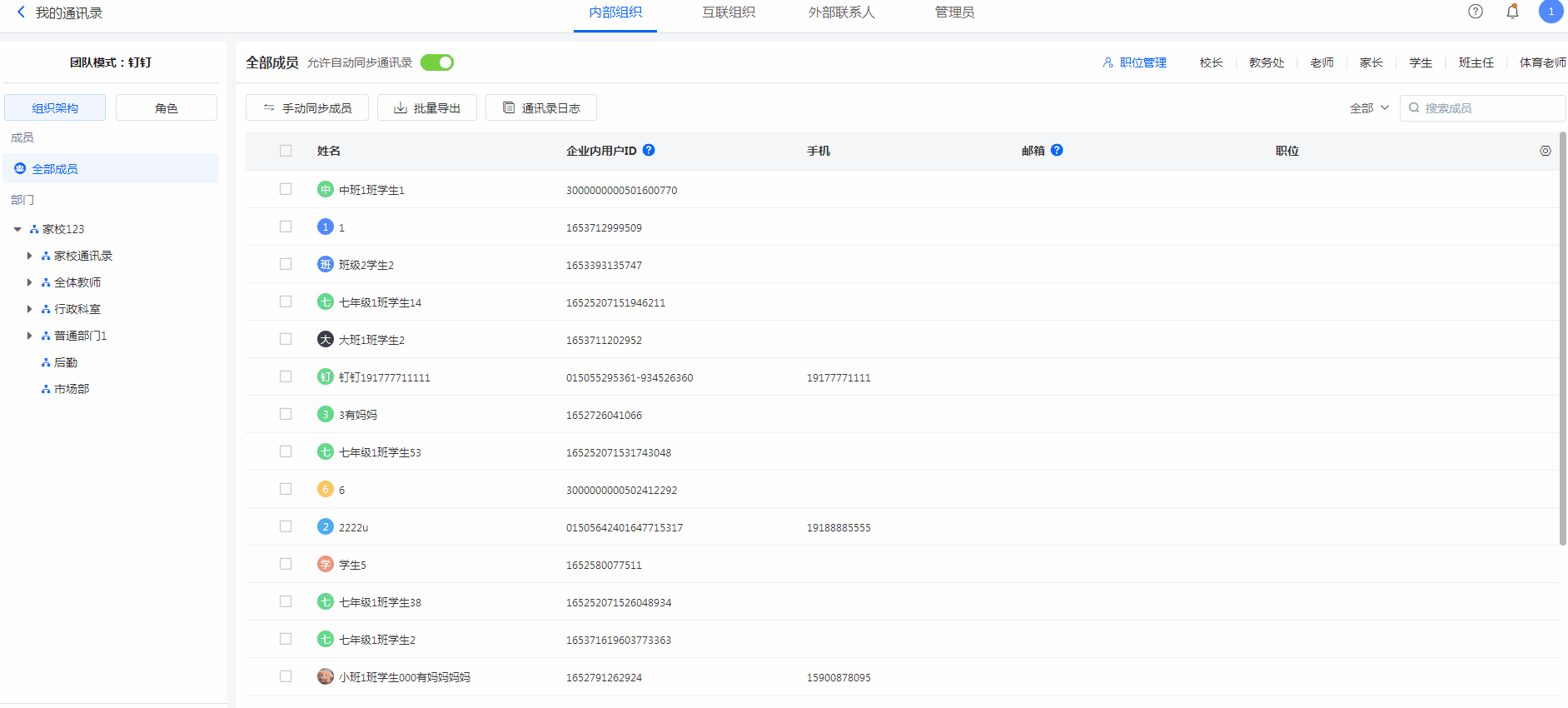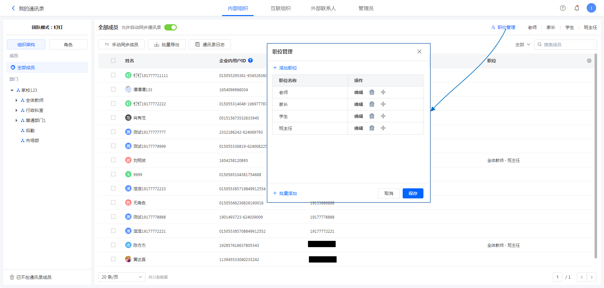 设置入口:通讯录->成员->全部成员->职位管理