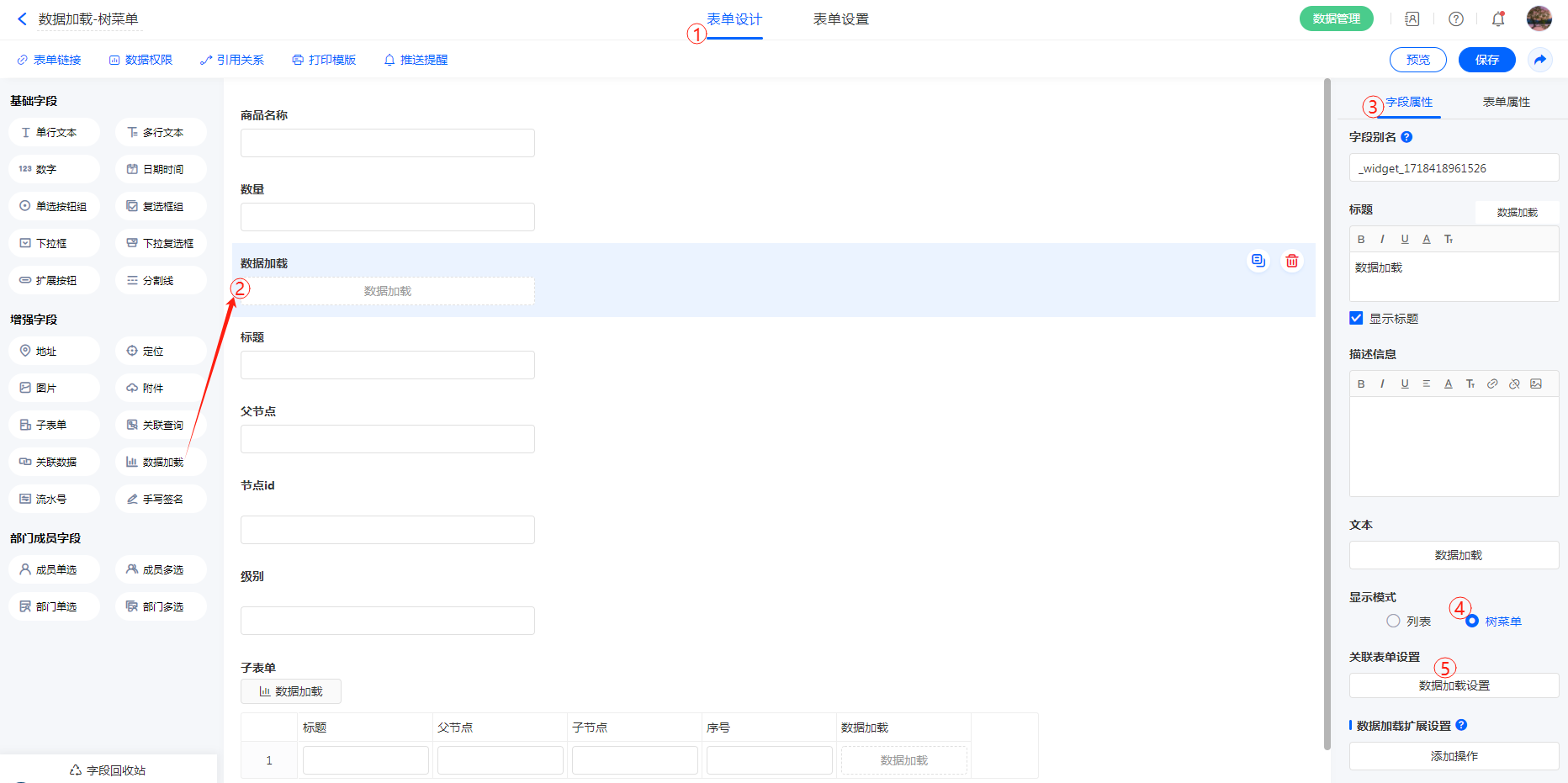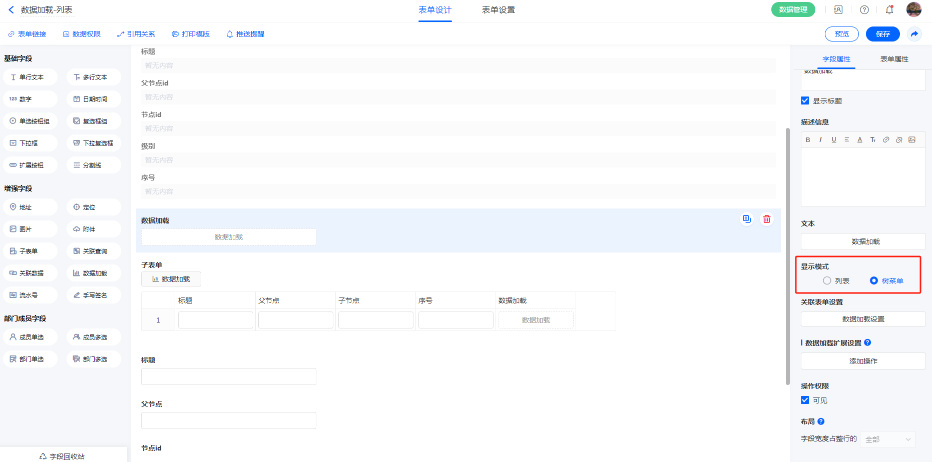 进入表单设计界面,拉取【数据加载】字段,字段属性>>显示模式选择【树菜单】,点击关联表单设置>>【数据加载设置】配置数据源 选择节点信息设置填充规则。