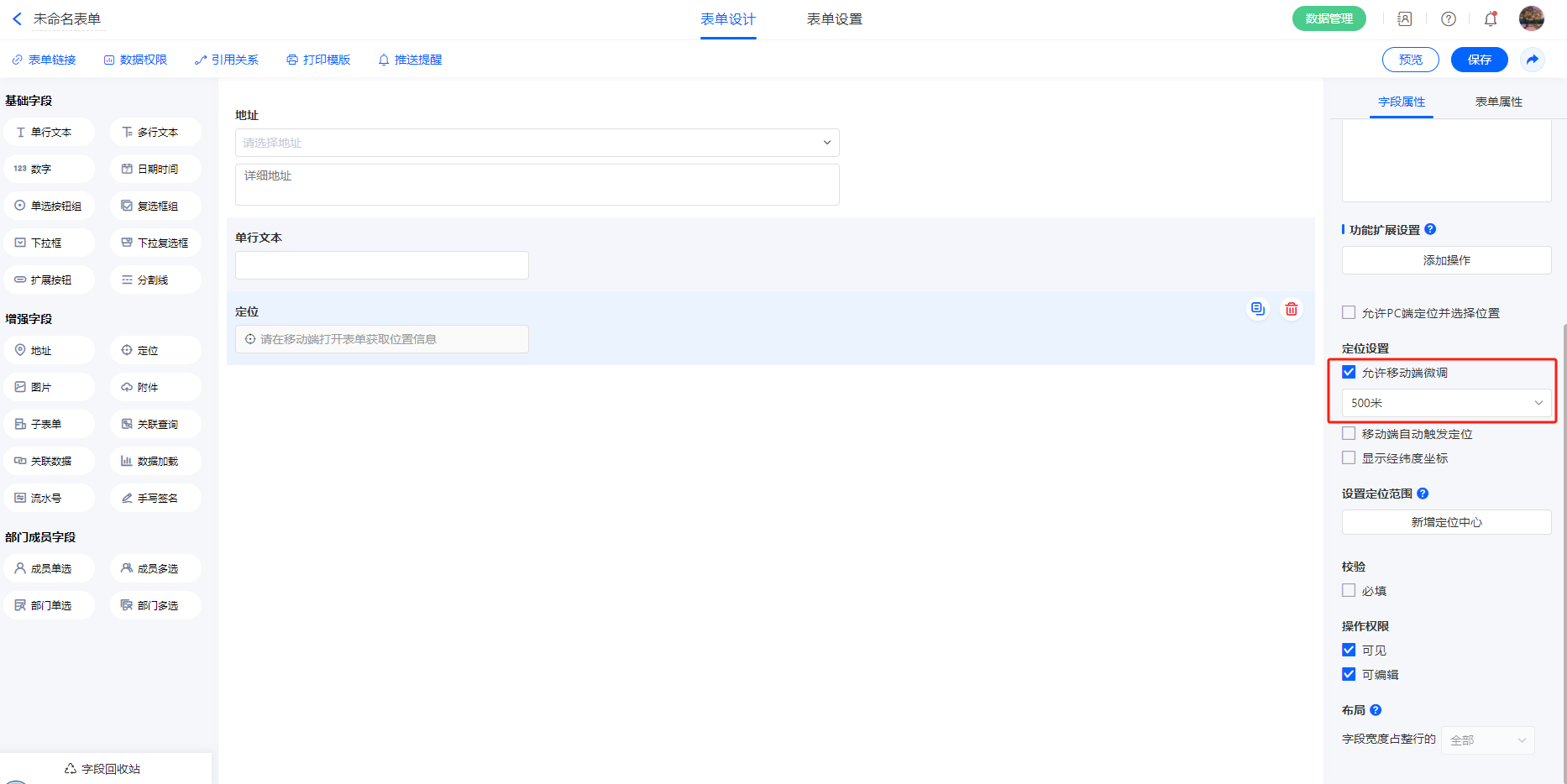 | 设置入口:表单设计-定位字段-【开启允许移动端微调】 |