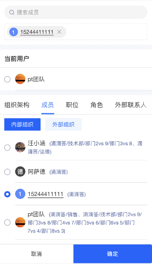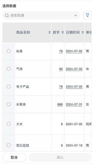 - 选择数据的面板中,支持模糊搜索及筛选条件搜索。