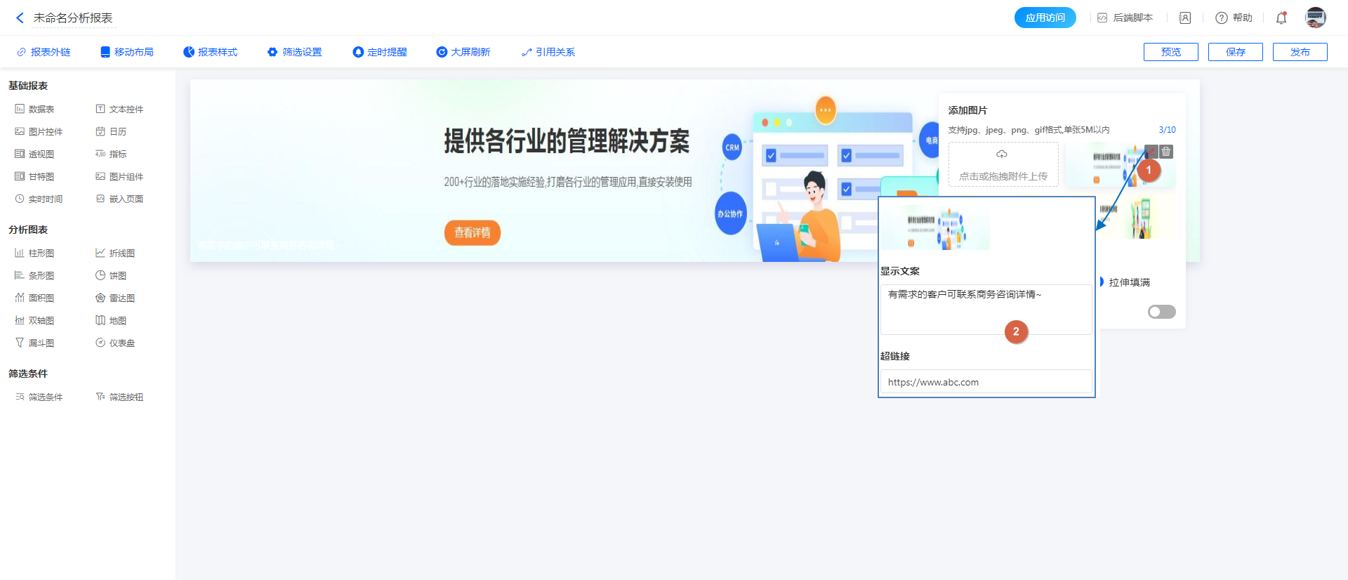 图片还可以添加显示文案与超链接,成员在访问仪表盘并点击图片时,即可跳转到链接地址中: