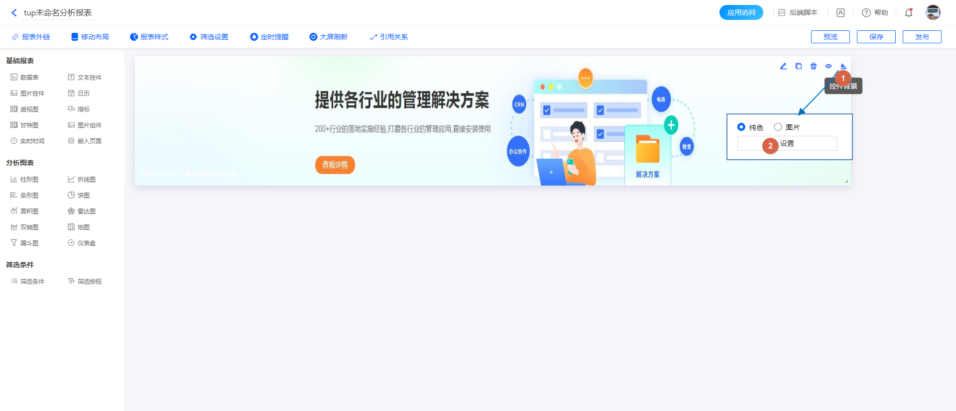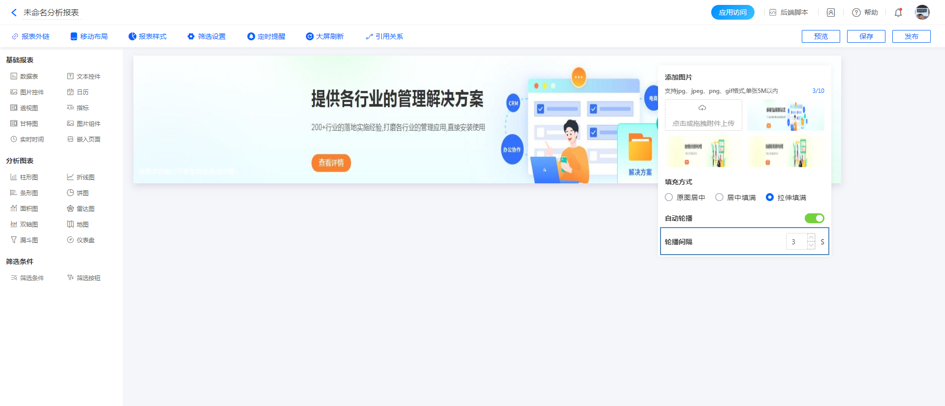 图片组件是仪表板中常用的一种组件,主要用于展示图片内容。可以用来呈现设计图、产品图片、流程图、地图等,使报表更直观、生动,更容易理解信息。