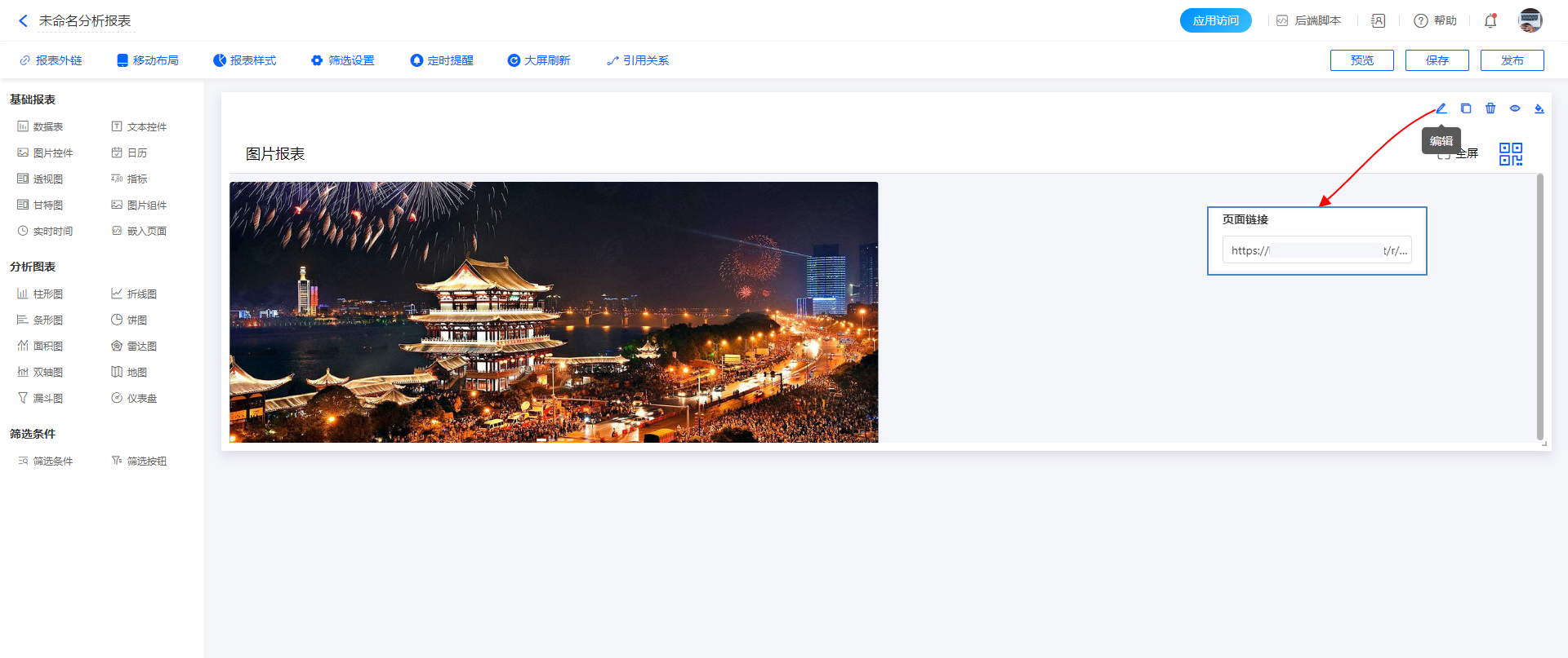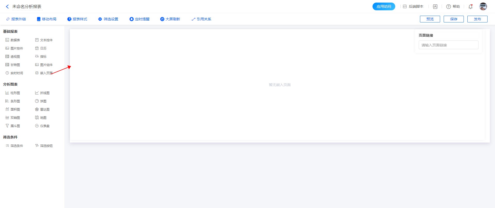 嵌入页面即 iframe,支持将其他网页嵌入在分析报表内。通过「嵌入页面」组件,输入 URL 地址,系统将自动根据 URL 地址信息显示网页。
