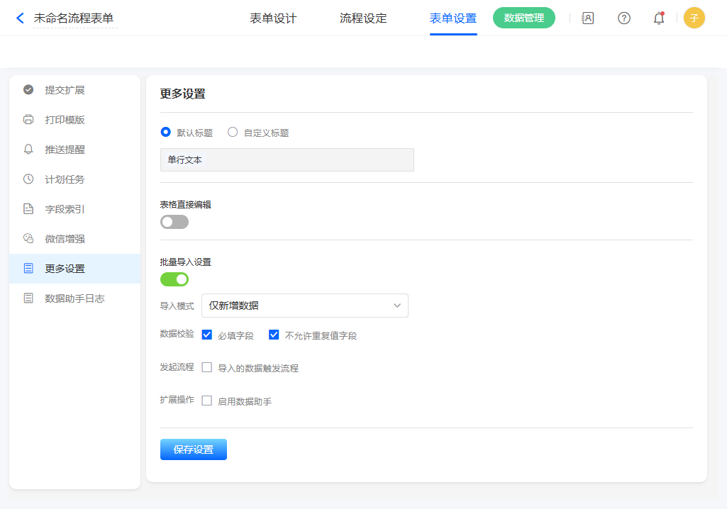 「保存设置」按钮: 点击后,所有已配置的参数(如标题、编辑权限、导入规则等)将被保存到系统中,后续表单操作将按照此次配置执行。