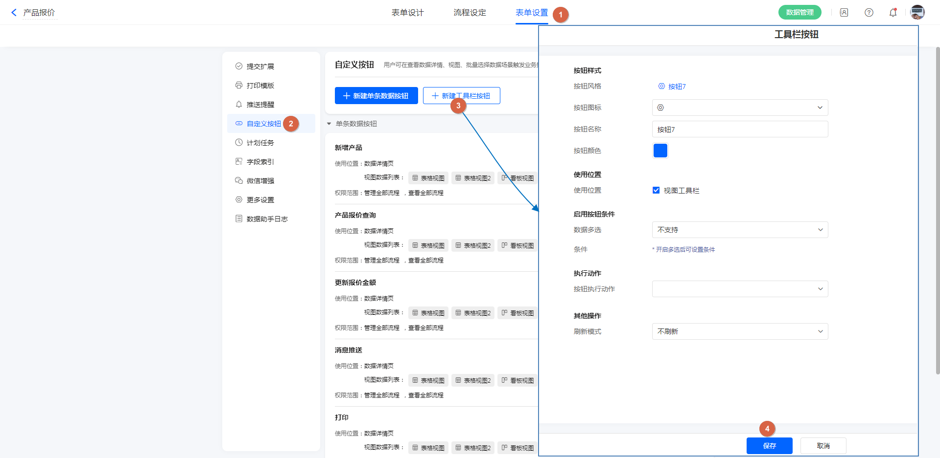 表单设置->自定义按钮->新建工具栏按钮。