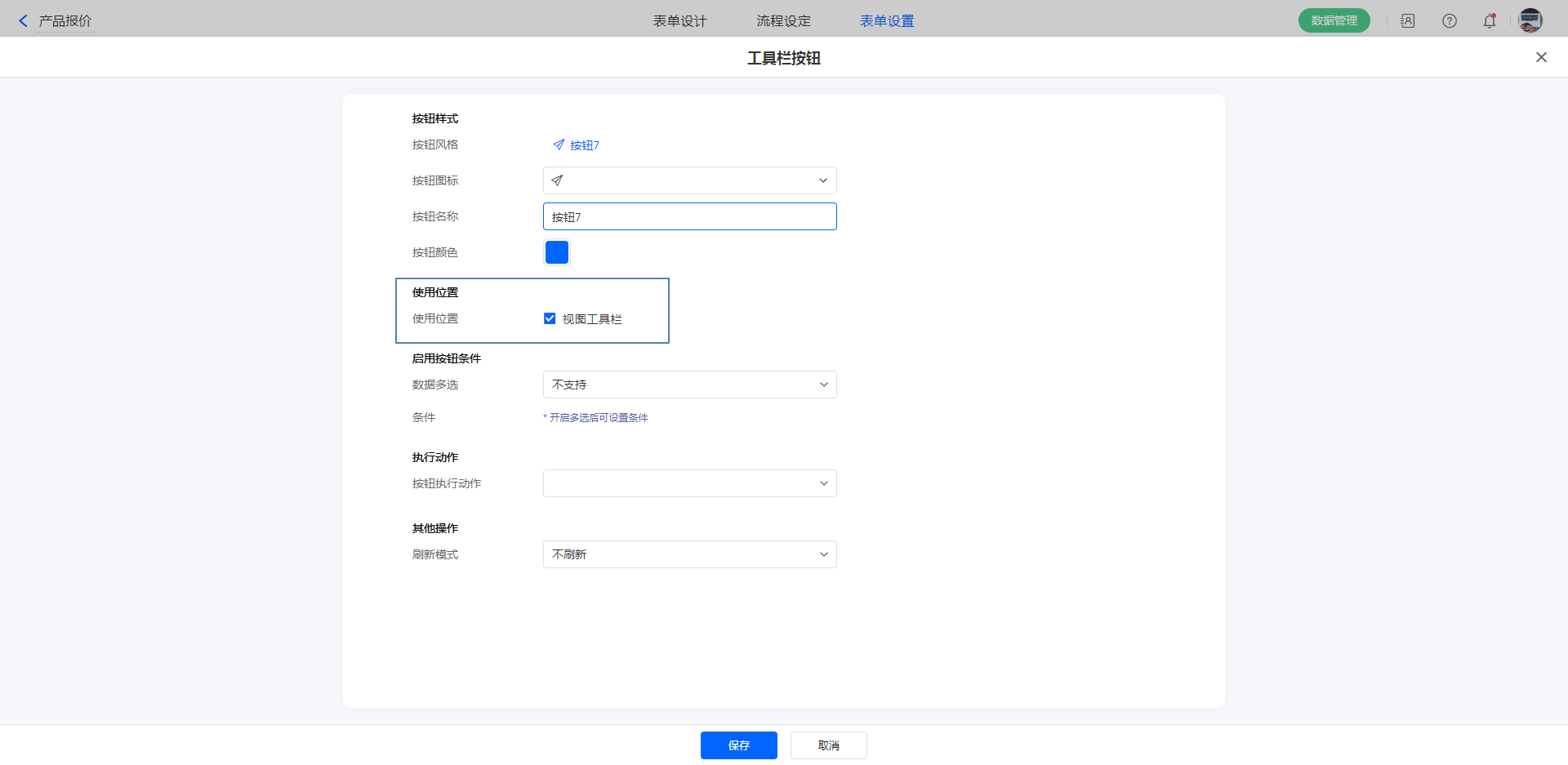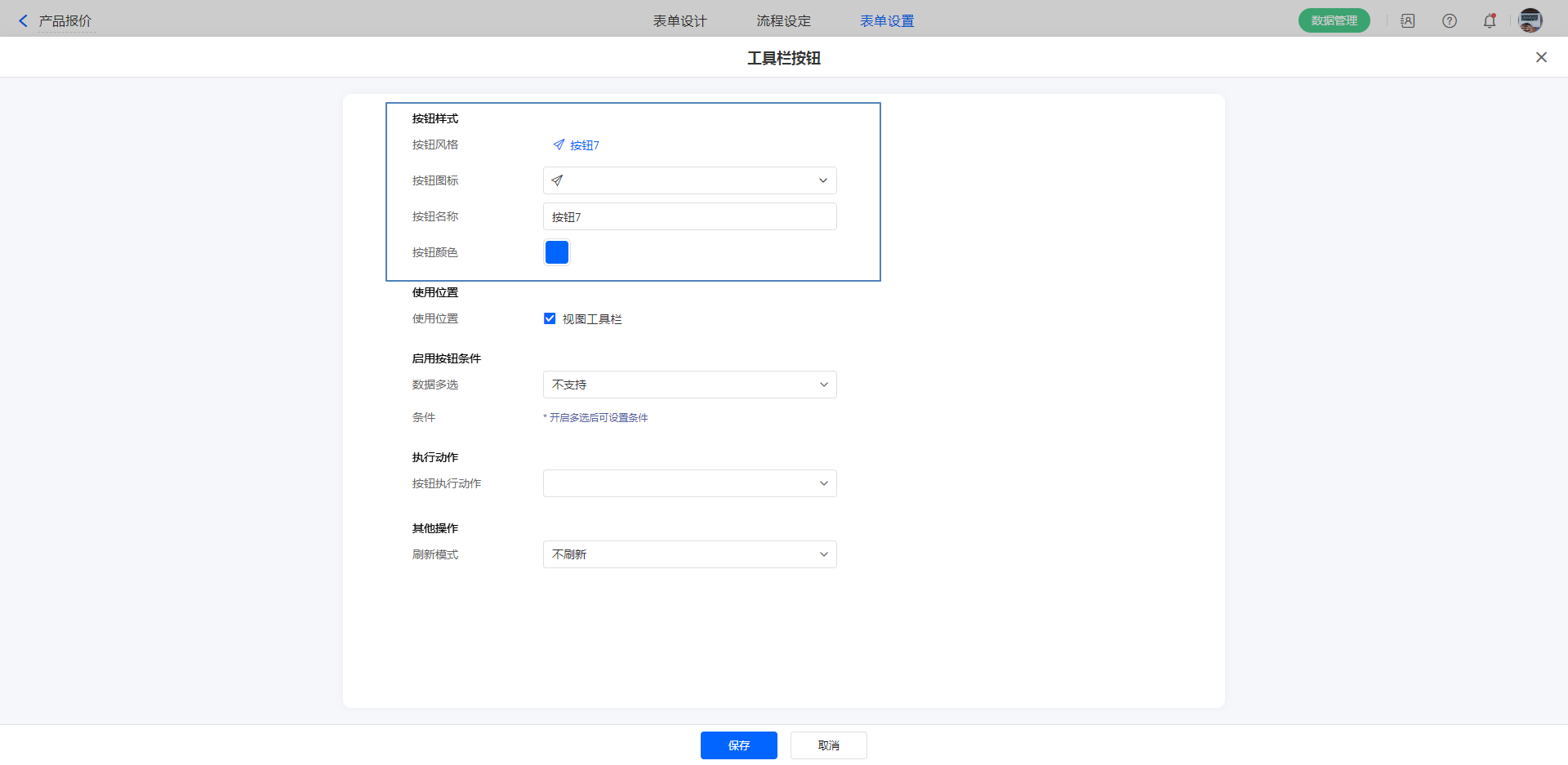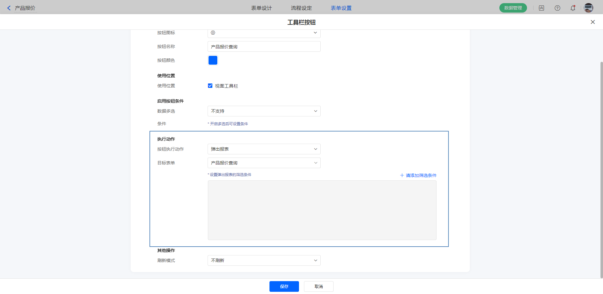 1)新建自定义按钮,配置好各项属性,执行动作选择:数据助手。
