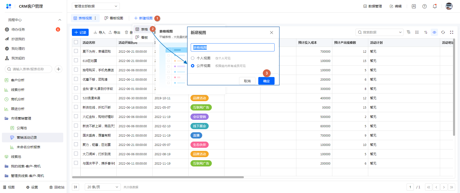 管理员访问,且管理员有表单访问数据权限组的权限,会显示 新建视图 入口,点击新建视图,选择对应的视图类型,设置个人视图或公开视图,点击确定即可完成视图创建。