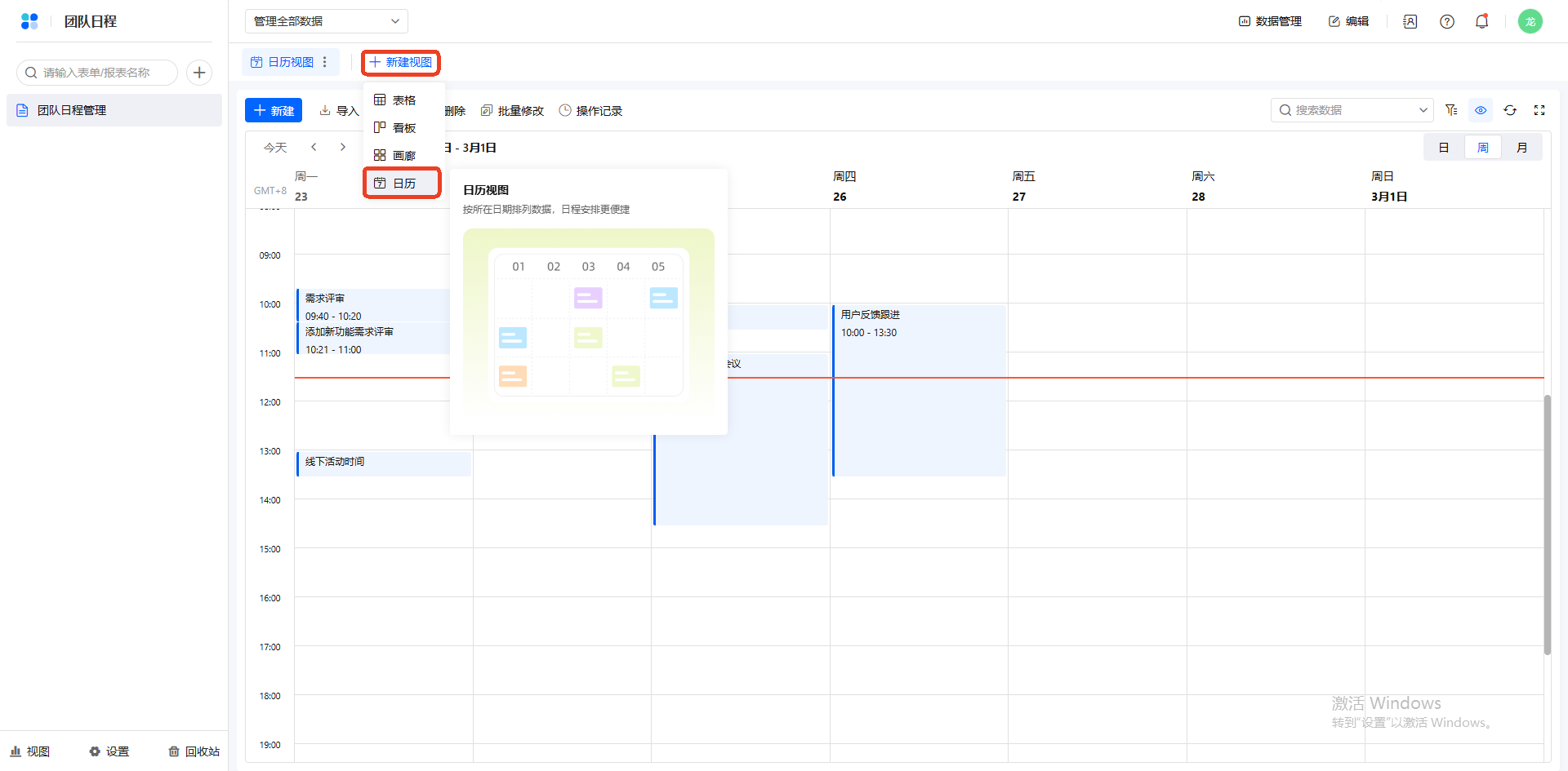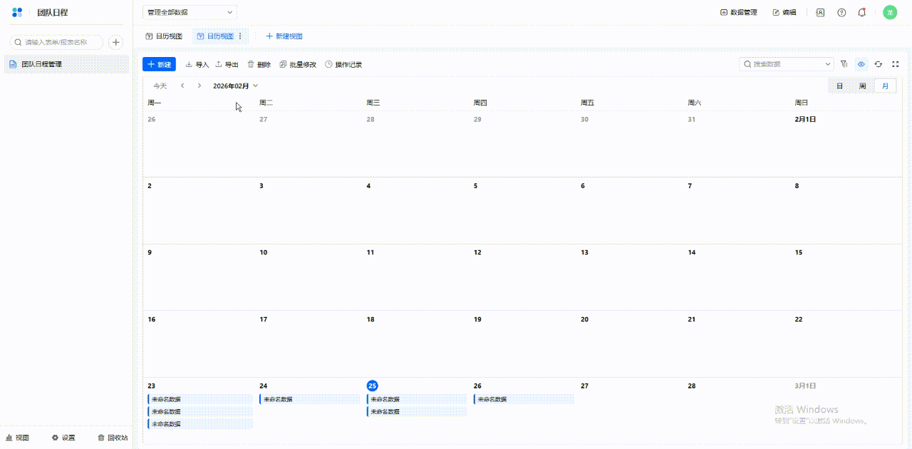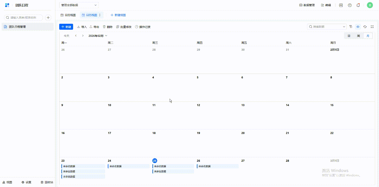 操作前提:日历日程中可展示哪些信息取决于数据表中的字段,因此在配置日历视图前,你需要先在数据表中创建需要的字段。