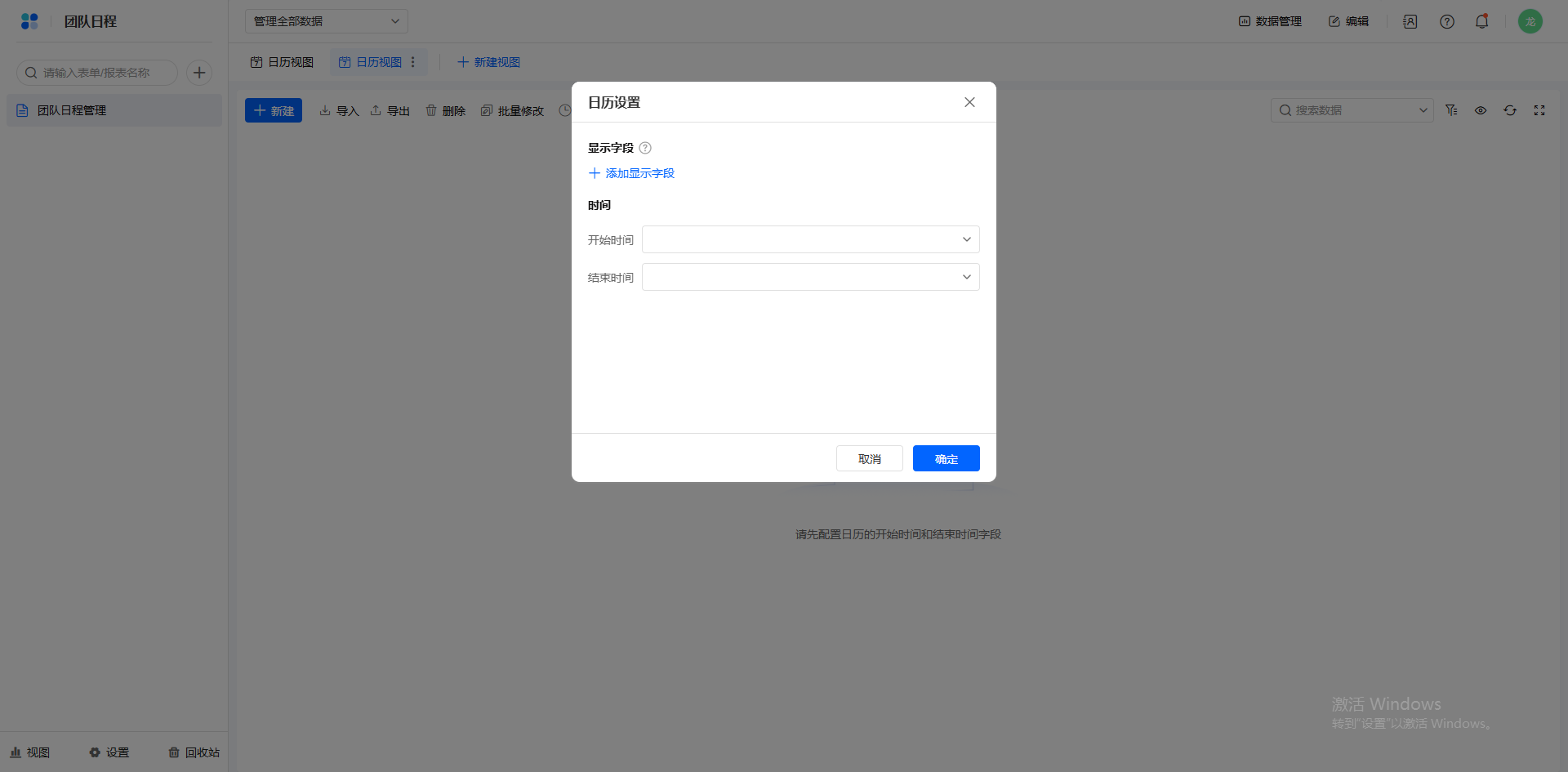 管理员如果拥有表单管理数据的权限,打开一个数据表,点击数据表上方的 + 新建视图 或 + 图标 选择 日历视图。设置显示字段和两个日期字段作为日程的开始和结束时间;