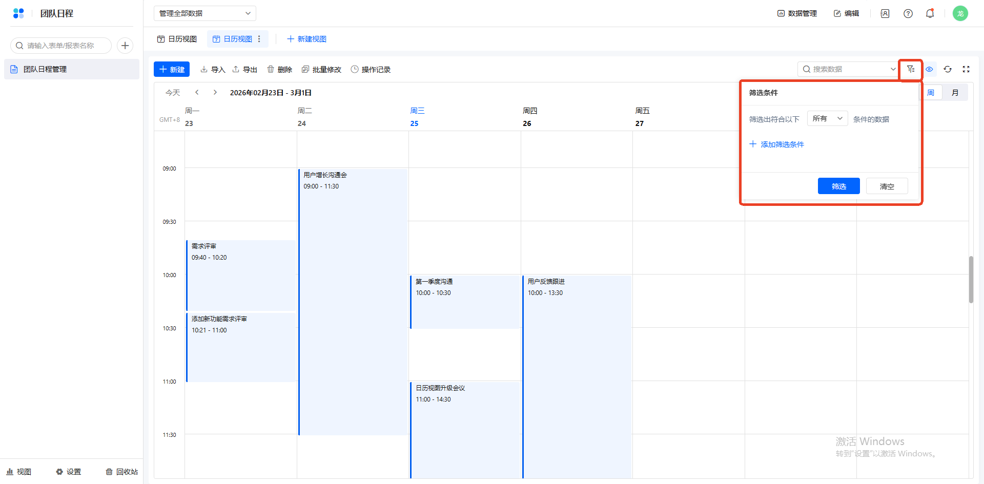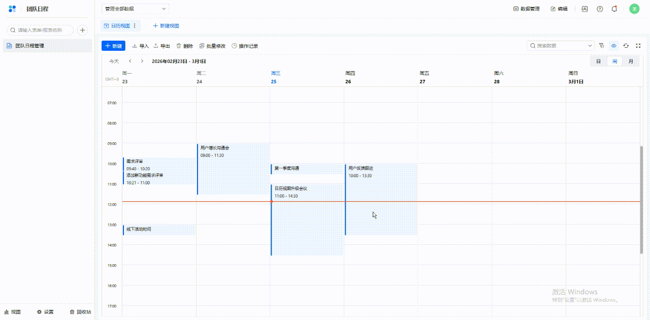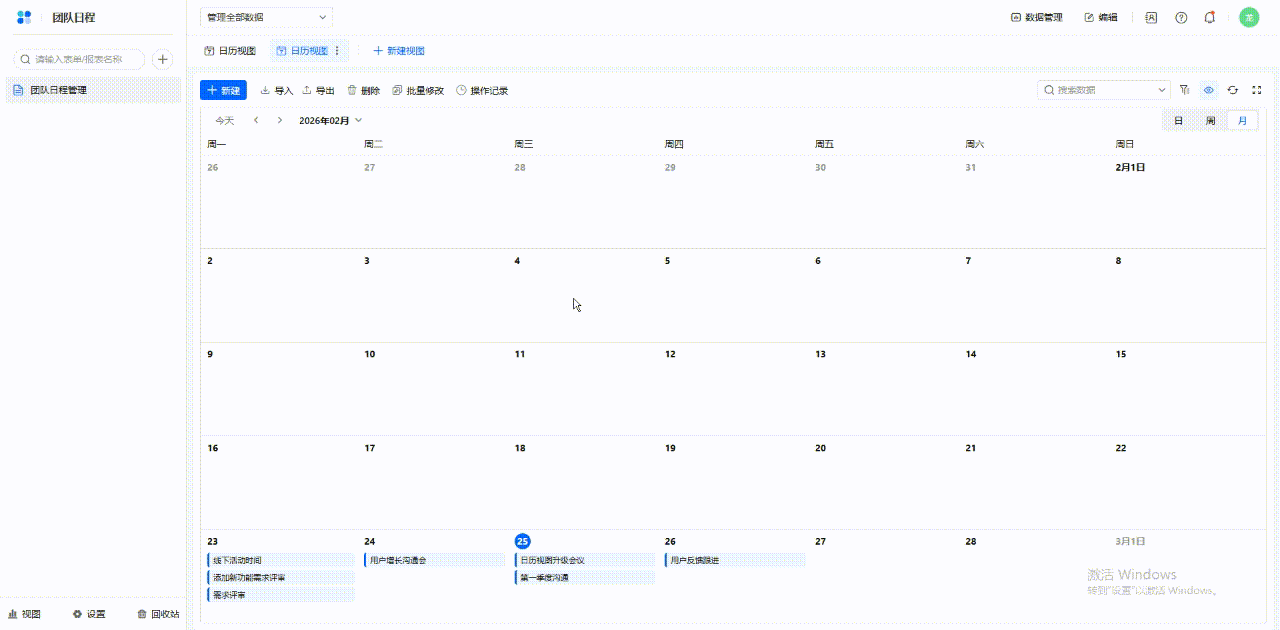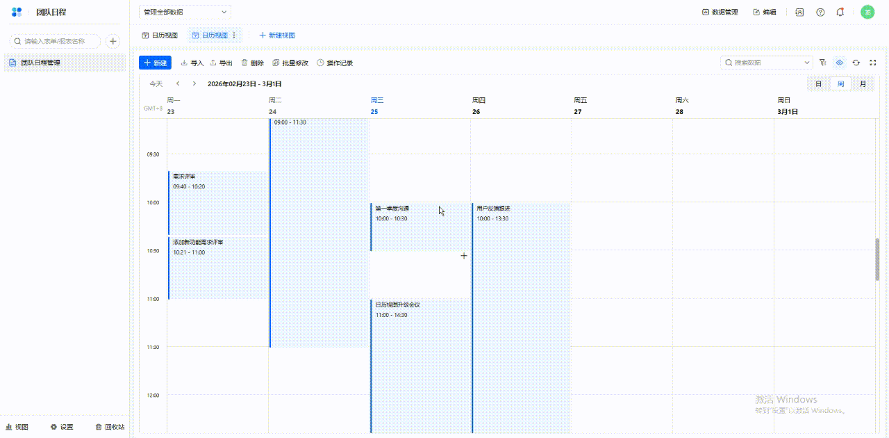 可以在表格使用日历视图管理日程。日历视图支持日、周、月三个时间展示维度,可以便捷地在日历上添加和管理日程,还可以自定义日程中展示的信息和日程样式。