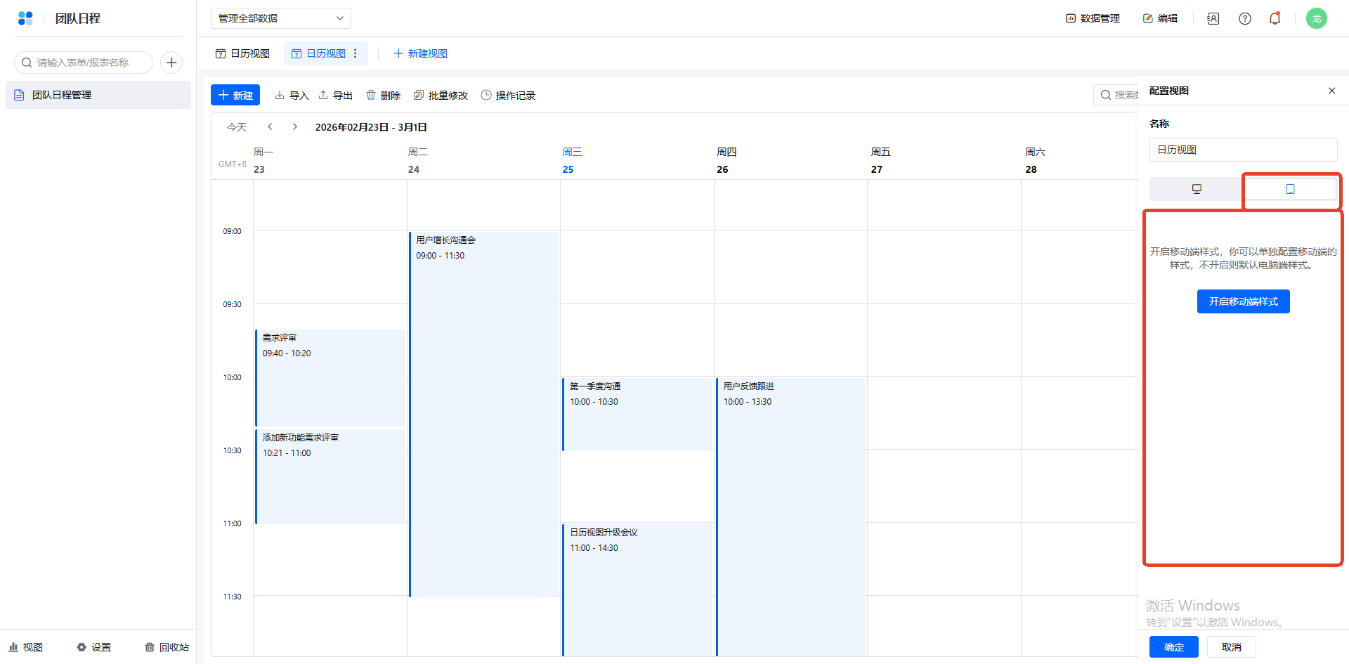 新建视图后,视图右侧操作菜单,点击配置,弹出视图配置弹窗,切换到移动端。