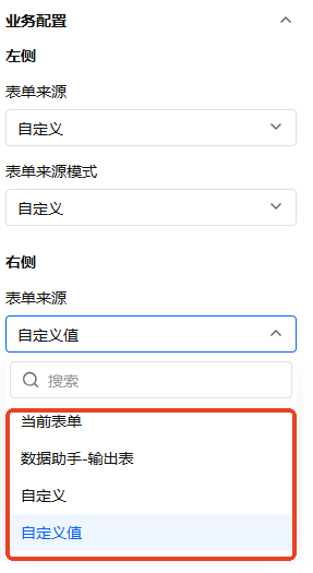 表单来源即数据来源于当前表单还是数据助手输出表,还是自定义表单、自定义值。