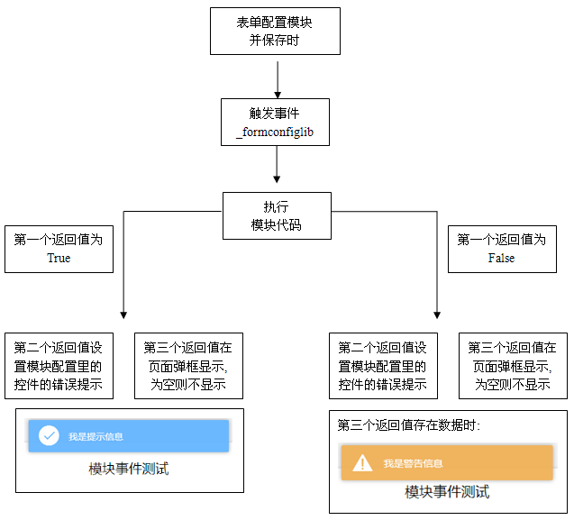 • 事件触发流程:触发事件后,前端页面会将 "当前插件配置信息", "当前表单别名","当前插件名称", "插件配置环境" 传给后端对应的插件中的。 "_formconfiglib"函数,然后执行"后端代码"并返回"返回结果"和"需要界面展示的数据"。