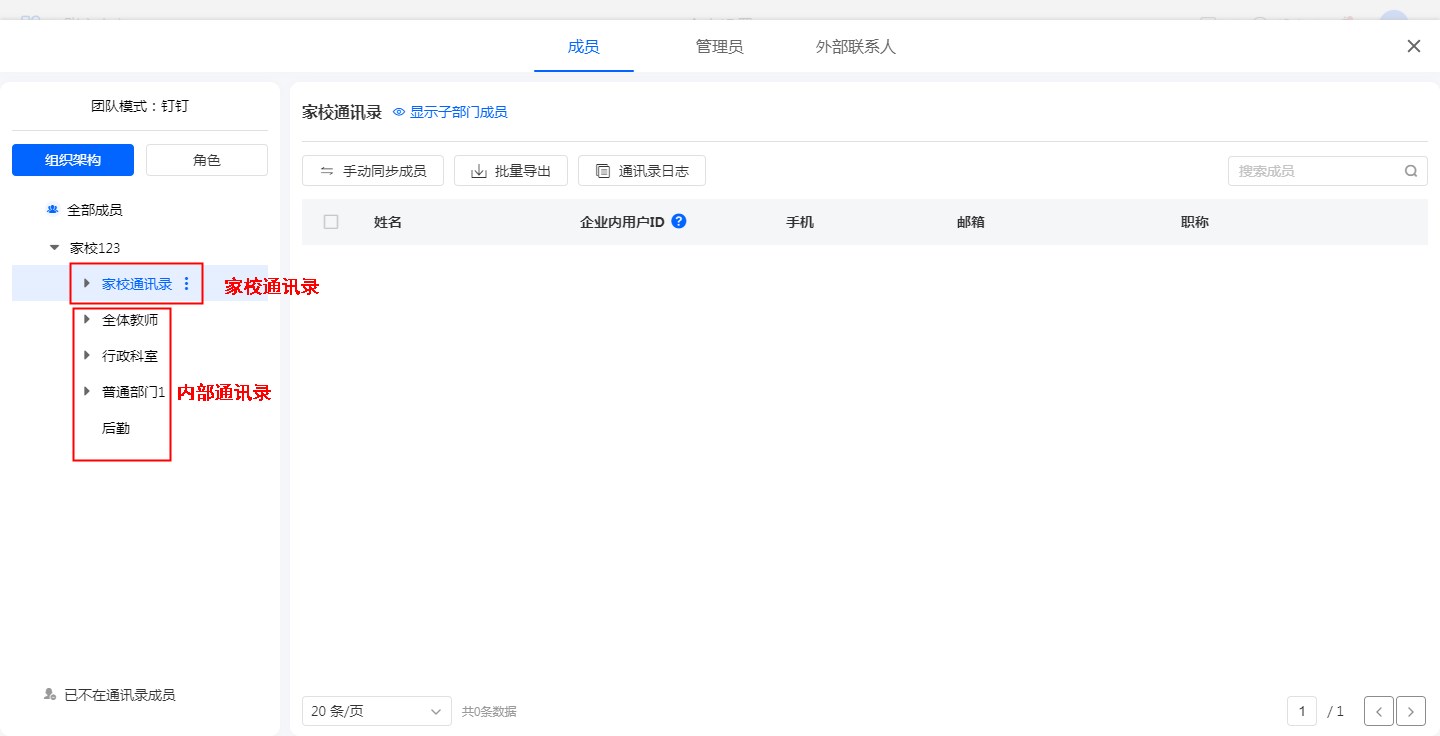 钉钉家校通讯录的成员同步到系统通讯录中,会根据身份自动加入家长、学生、老师部门,且拥有对应的家长/学生/老师职称。
