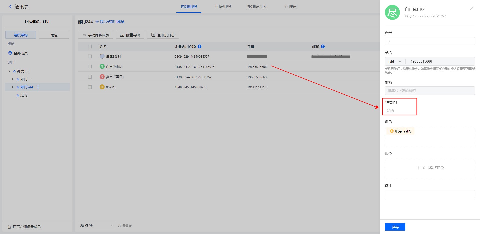 钉钉通讯录中成员主部门信息支持同步。
