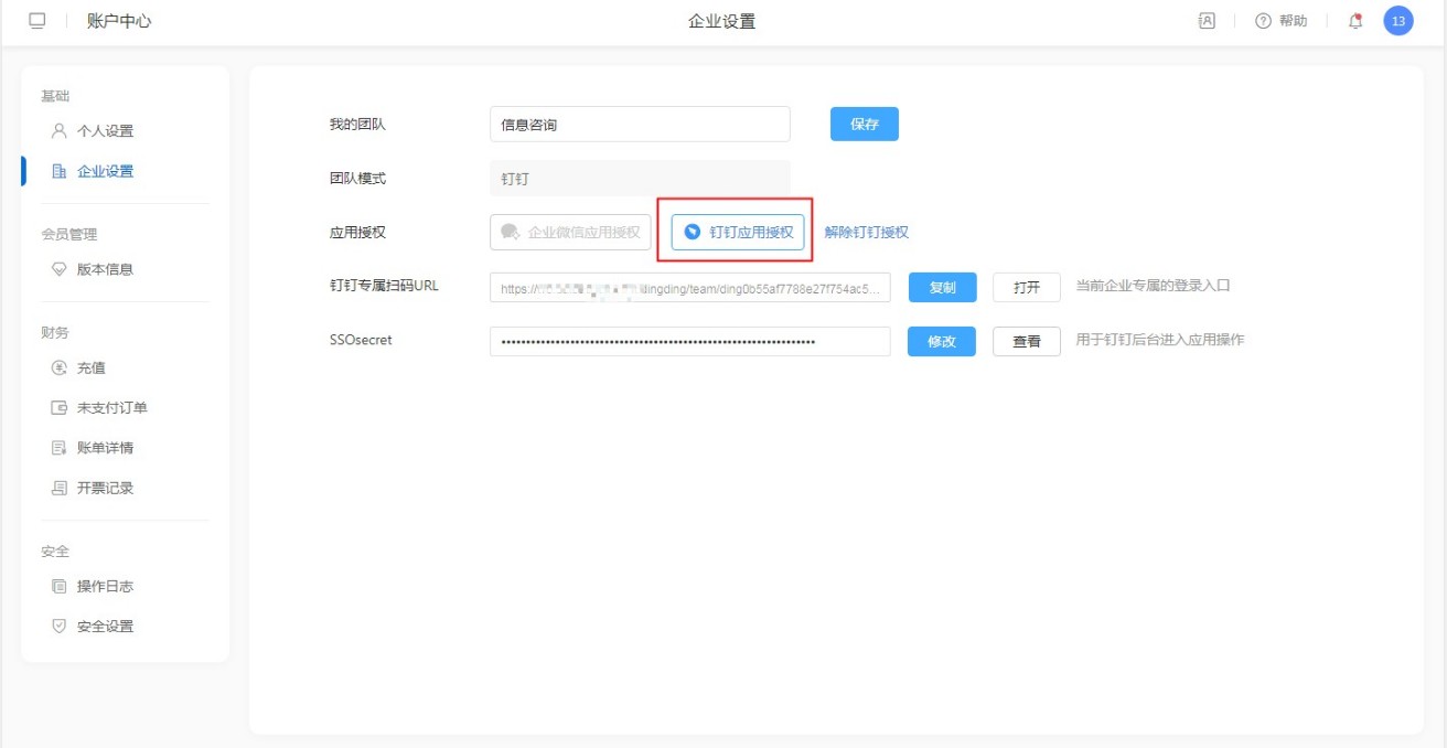 用户通过百数账号登录系统后,进入【右侧头像】-【账号中心】-【企业设置】,在企业设置中可以进行钉钉应用授权。