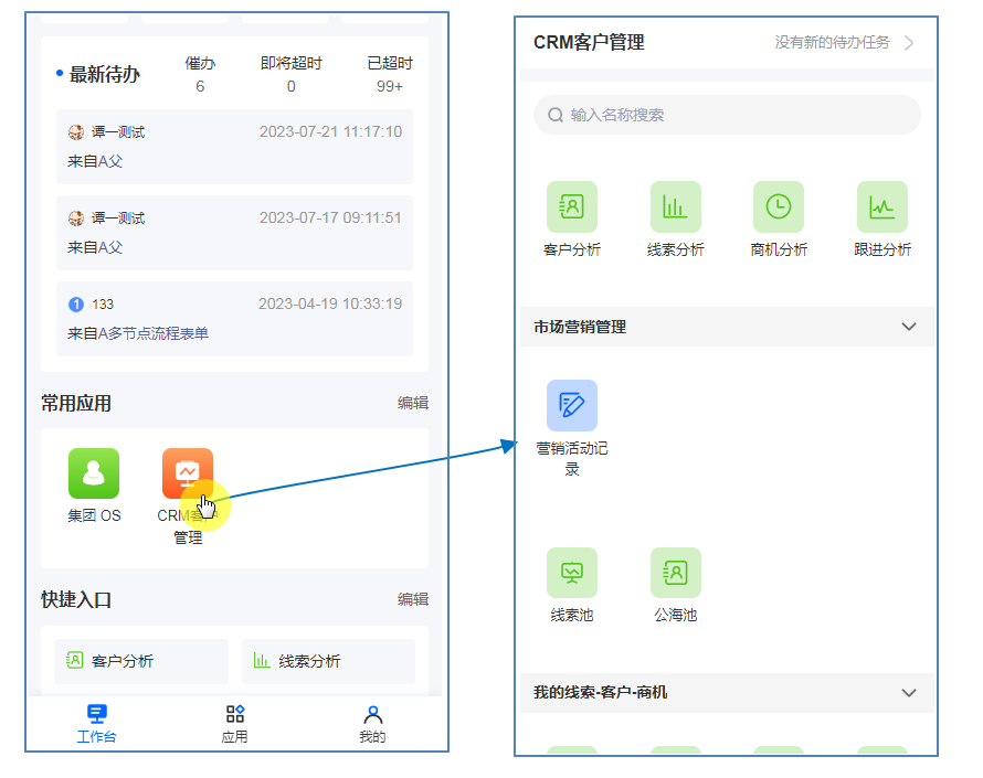 对于已经安装好的应用,除了在工作台内通过快捷访问打开,还可在页面下方点击【应用】后找到需要使用的应用。