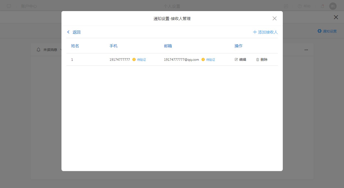【消息中心】-【通知设置】-【消息接收人管理】,可以看到已经添加的消息接收人,也可以添加新的消息接收人。