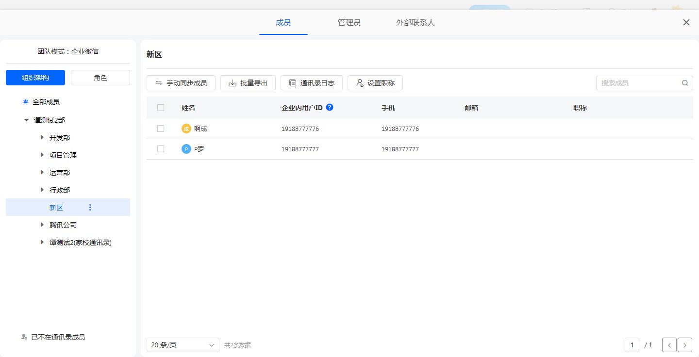 通讯录页面点击单条成员数据可以查看详情并进行姓名/企业ID/手机/邮箱/部门/角色/职位等信息的修改。