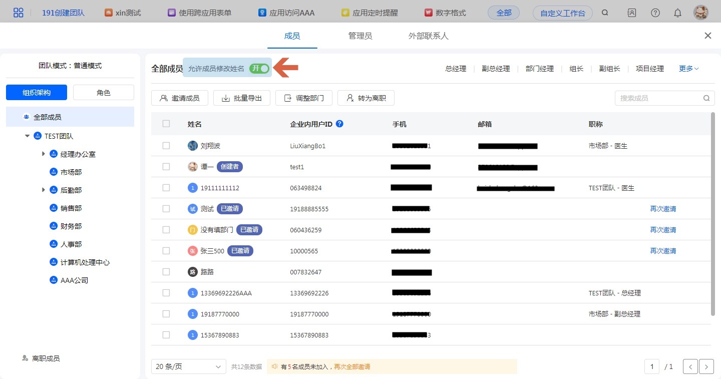 如需团队成员自行更改姓名,则需要在通讯录中勾选允许成员修改姓名。