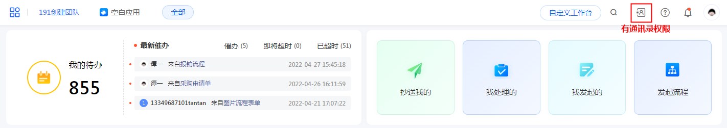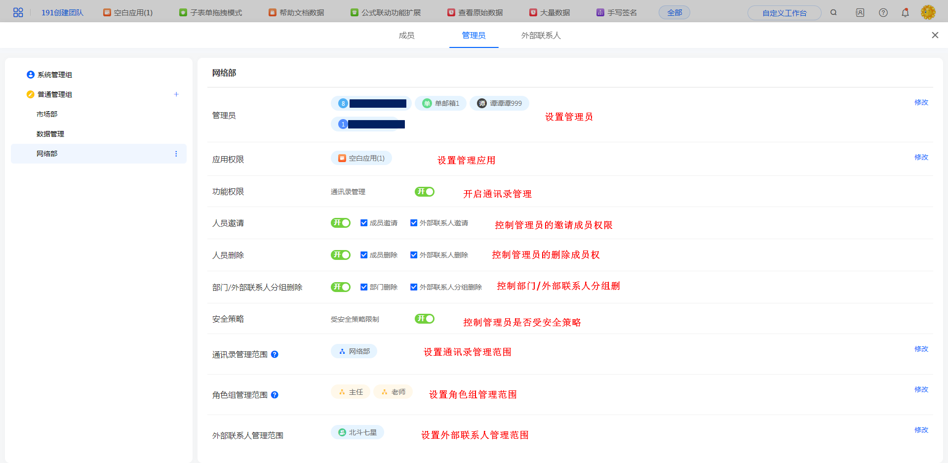 • 功能权限:开启【通讯录管理】,普通管理员可以进入通讯录进行相关权限操作;关闭则无法进入通讯录。