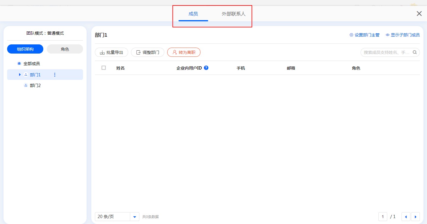 • 当外部联系人作为子管理员时,不能管理通讯录内部成员和部门,因此其成员面板不可见。