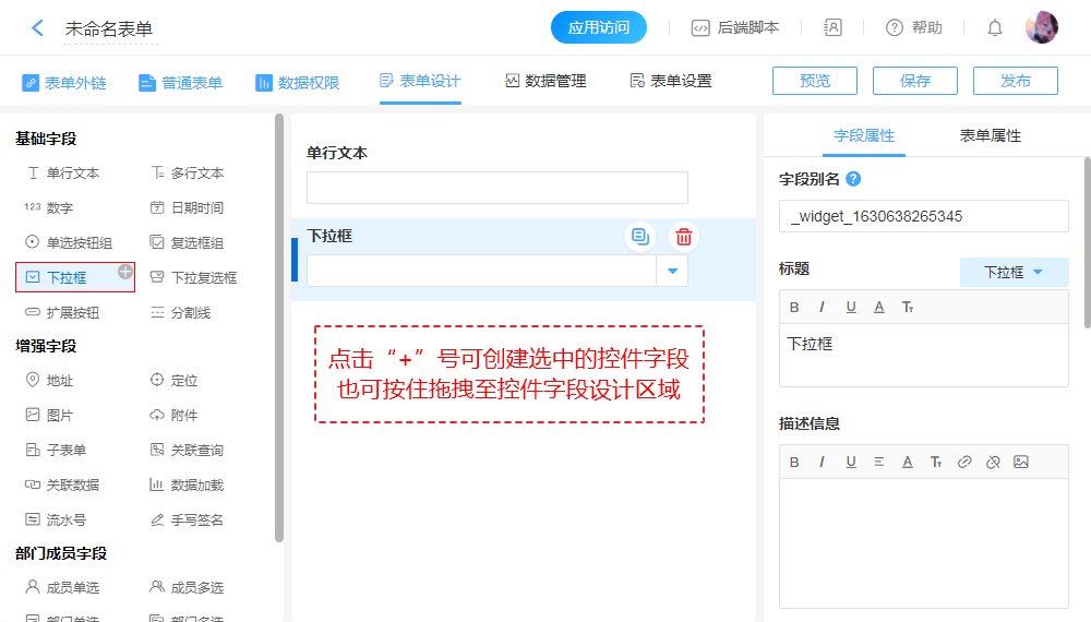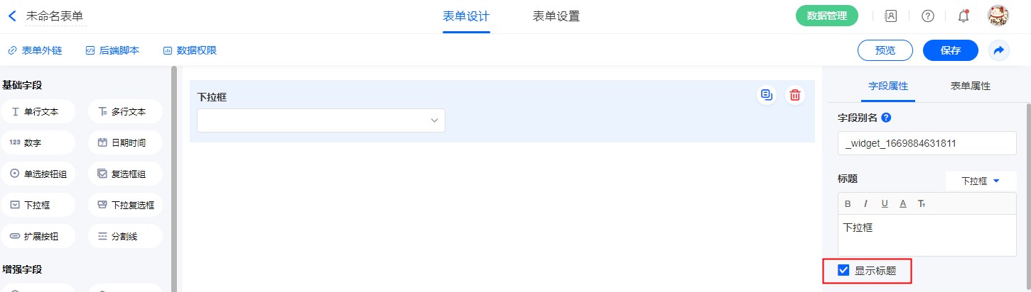 “下拉框”控件字段,可以修改转为“单选按钮组”或“单行文本”。