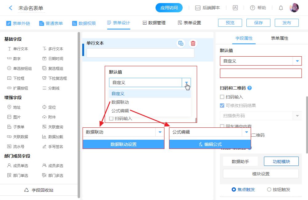 | 公式编辑 | 即单行文本的值是由公式来自动计算出的。 |