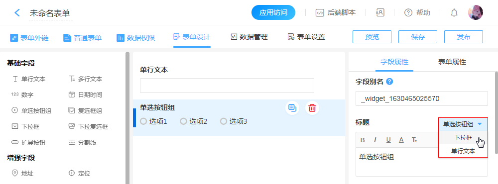 “单选按钮组”控件字段,可以修改转为“下拉框”或“单行文本”。