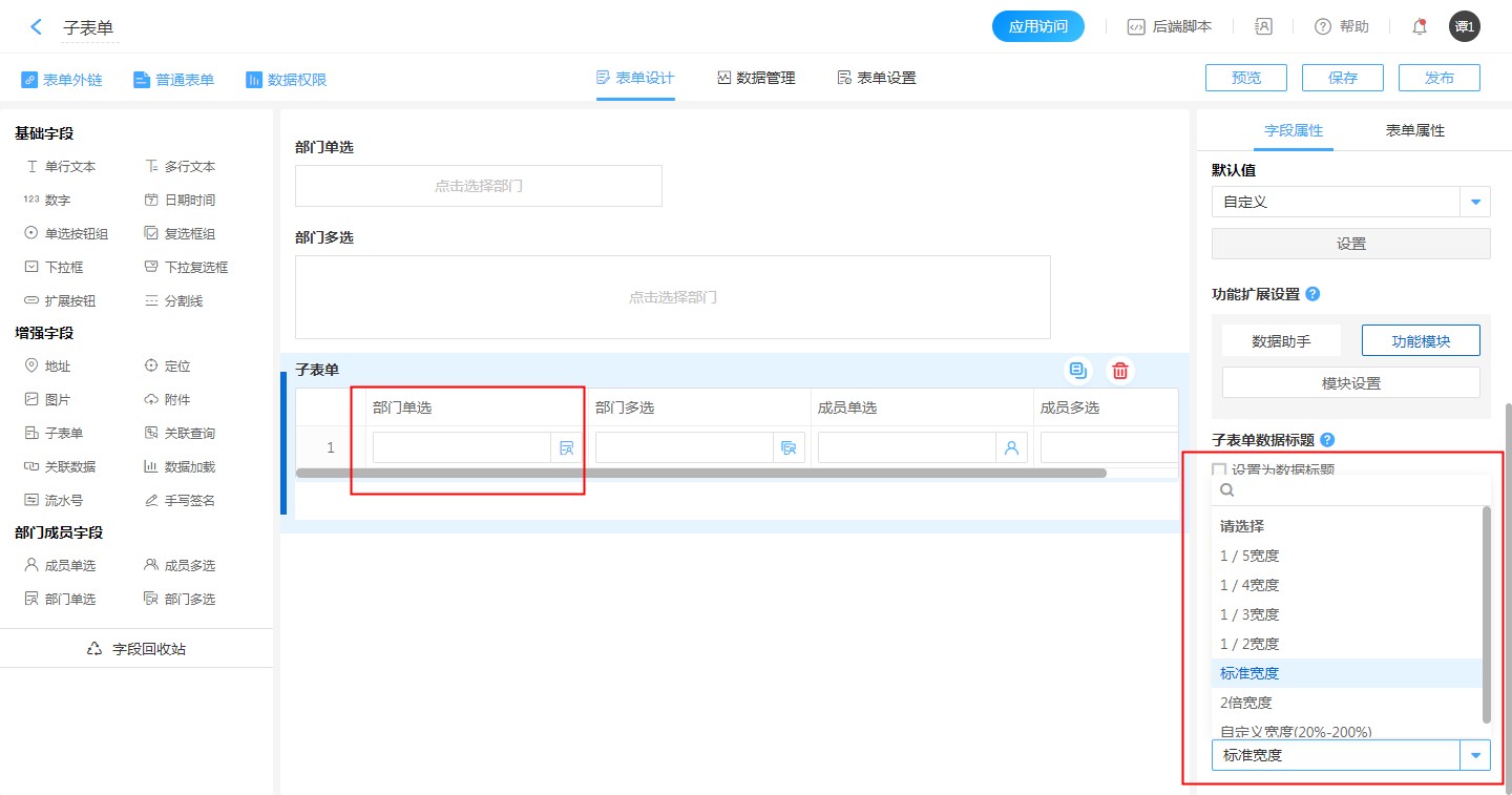 • 子表单内的字段宽度支持自定义,系统内置1/5宽度~2倍宽度,另可以设定自定义宽度,自定义宽度可以设置百分比[20% ~ 200%]。