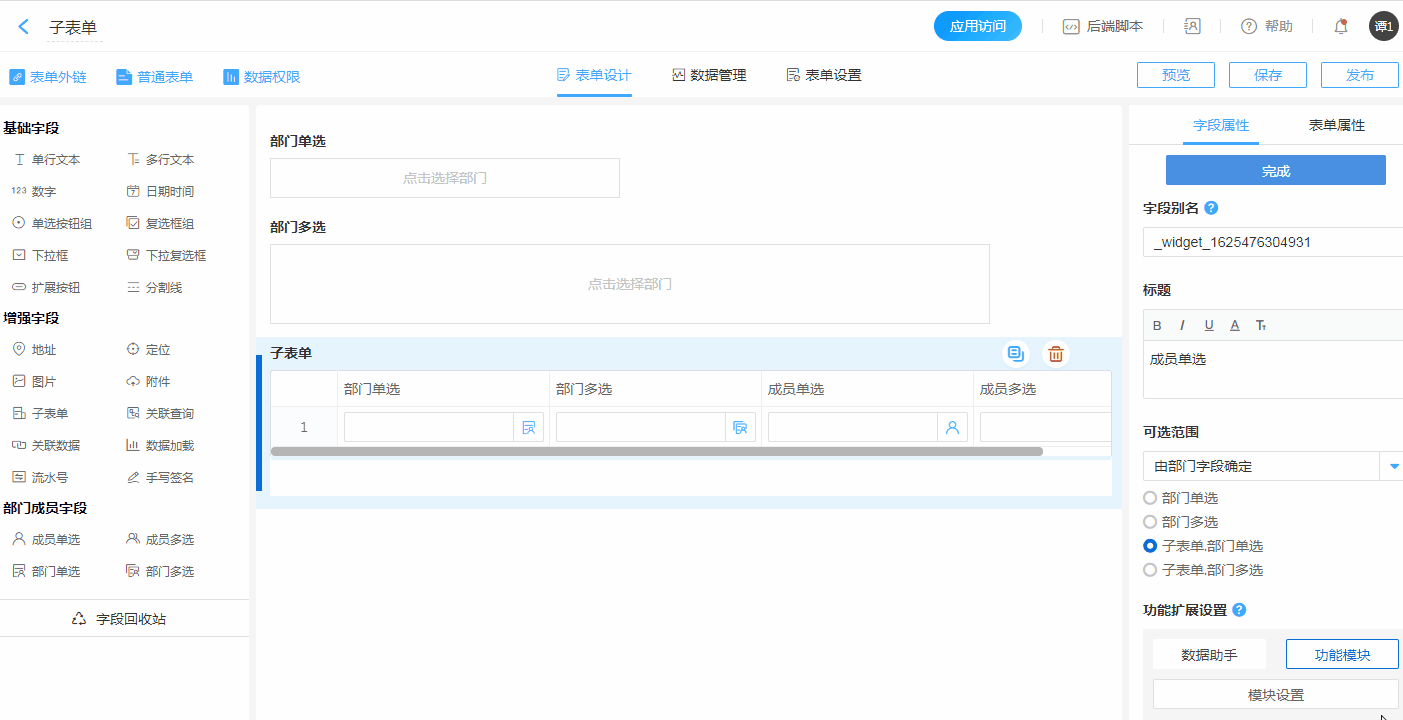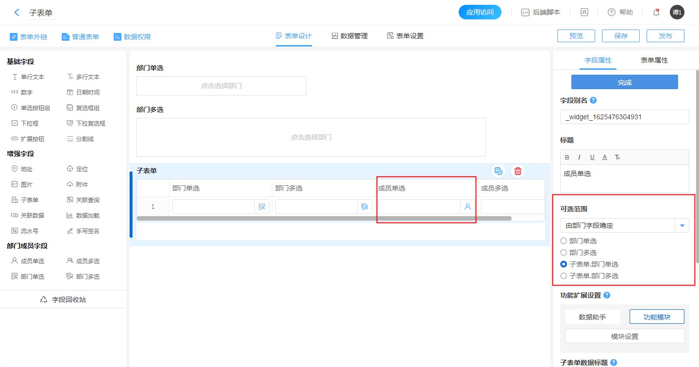 子表单内的成员控件的可选范围可以根据子表单内或子表单外的部门控件决定。