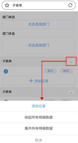注意:如果成员控件的可选范围是根据子表单内的部门控件选择,那么成员控件的可选范围仅对单行有效,第二行可以重新选择部门,限定第二行的成员可选范围。