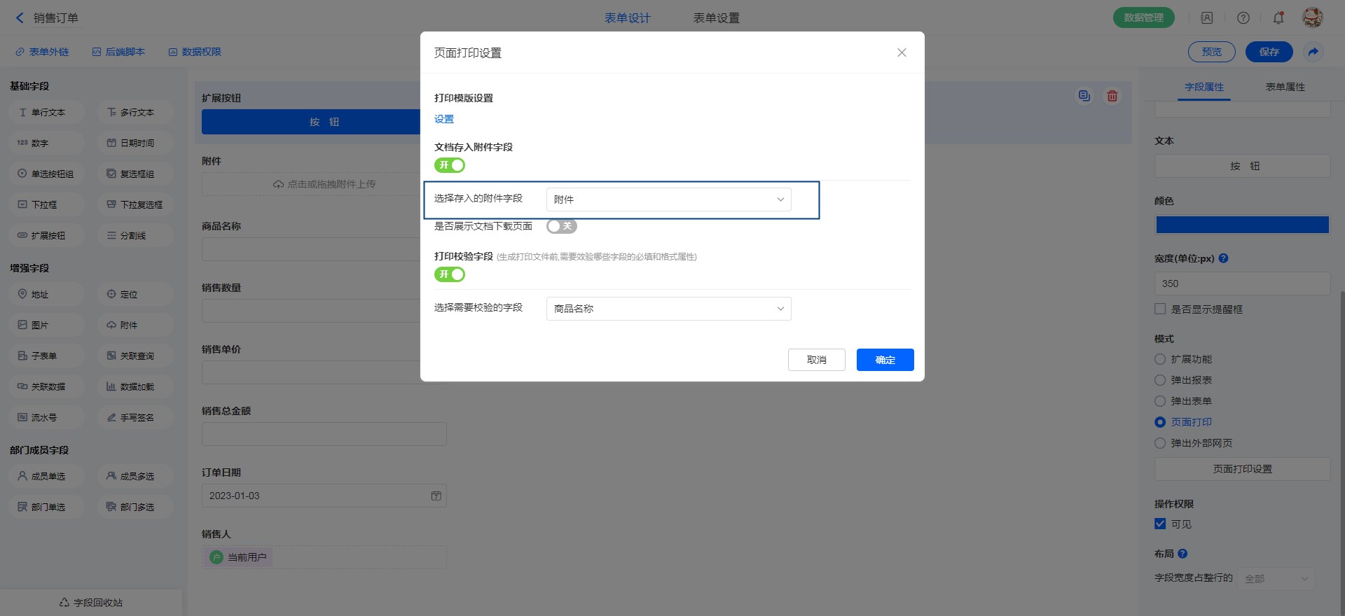 • 如:点击按钮打印后会生成一份PDF文件,可以设置将此PDF文件自动存入附件字段中。