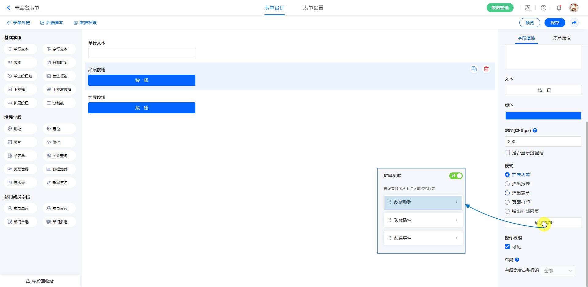 数据助手是扩展按钮基本功能之一,设置扩展按钮的属性为